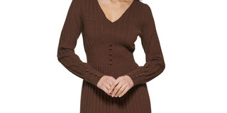 Kensie Women's Pintuck Long Sleeve Sweater Knit Dress Brown Size Medium