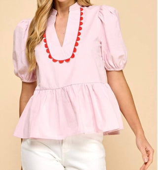 Tcec - Scalloped Split V-neck Puff Sleeve Top