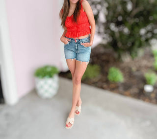 Entro - Women's V Neck Collar Dusty Ruffle Button Back Tank
