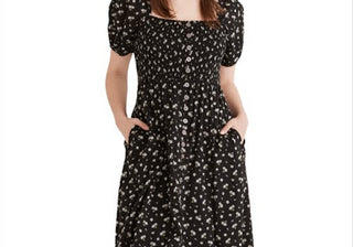 Madewell Smocked Square Neck Cotton Blend Dress in Ditsy Floral True Black Size Large
