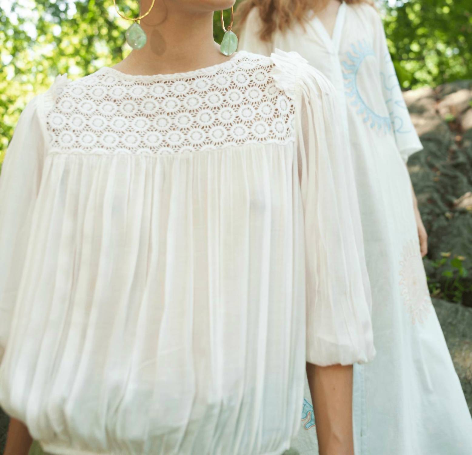 Introducing the Ulla Blouse by Guadalupe Design, a beautifully beige piece perfect for various occasions like Thanksgiving or housewarming gatherings. Featuring textured three-quarter sleeves, a stylish boatneck, and delicate lace strips for added charm. Made from 100% Viscose, it includes an undergarment camisole and secures with a back neck button closure. Care instructions: Machine wash cold, tumble dry low, steam iron; dark colors should be washed separately.