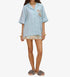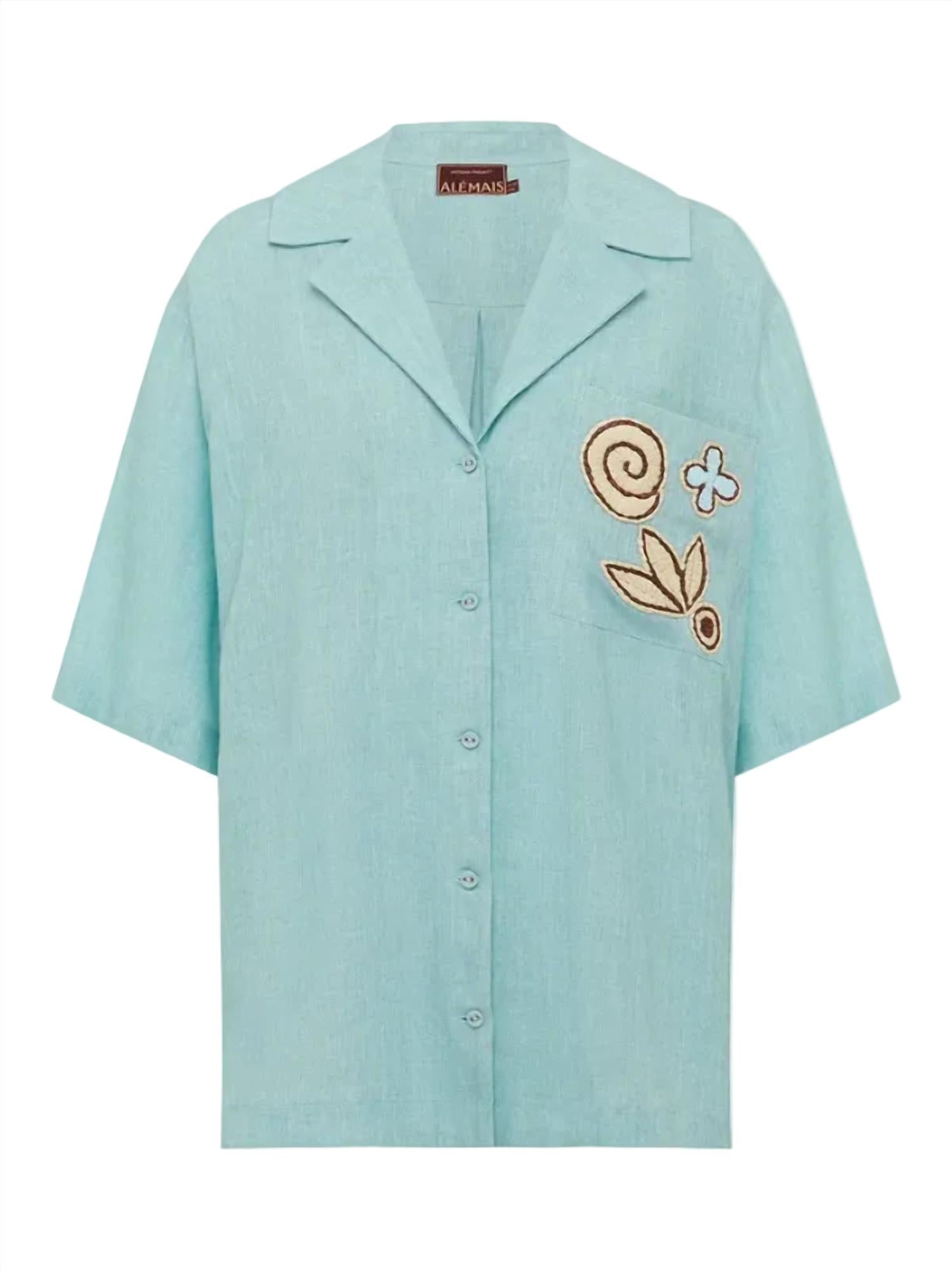 Introducing the Azar Shirt by ALEMAIS, a boho chic piece perfect for a summer beach day. This women's button-down shirt comes in a striking blue with a unique pattern, showcasing artwork from Laurence Leenaert. Made from 100% Linen, it features short sleeves, a stylish camp collar, and convenient pockets. The shirt is completed with corded raffia button closure and is imported.