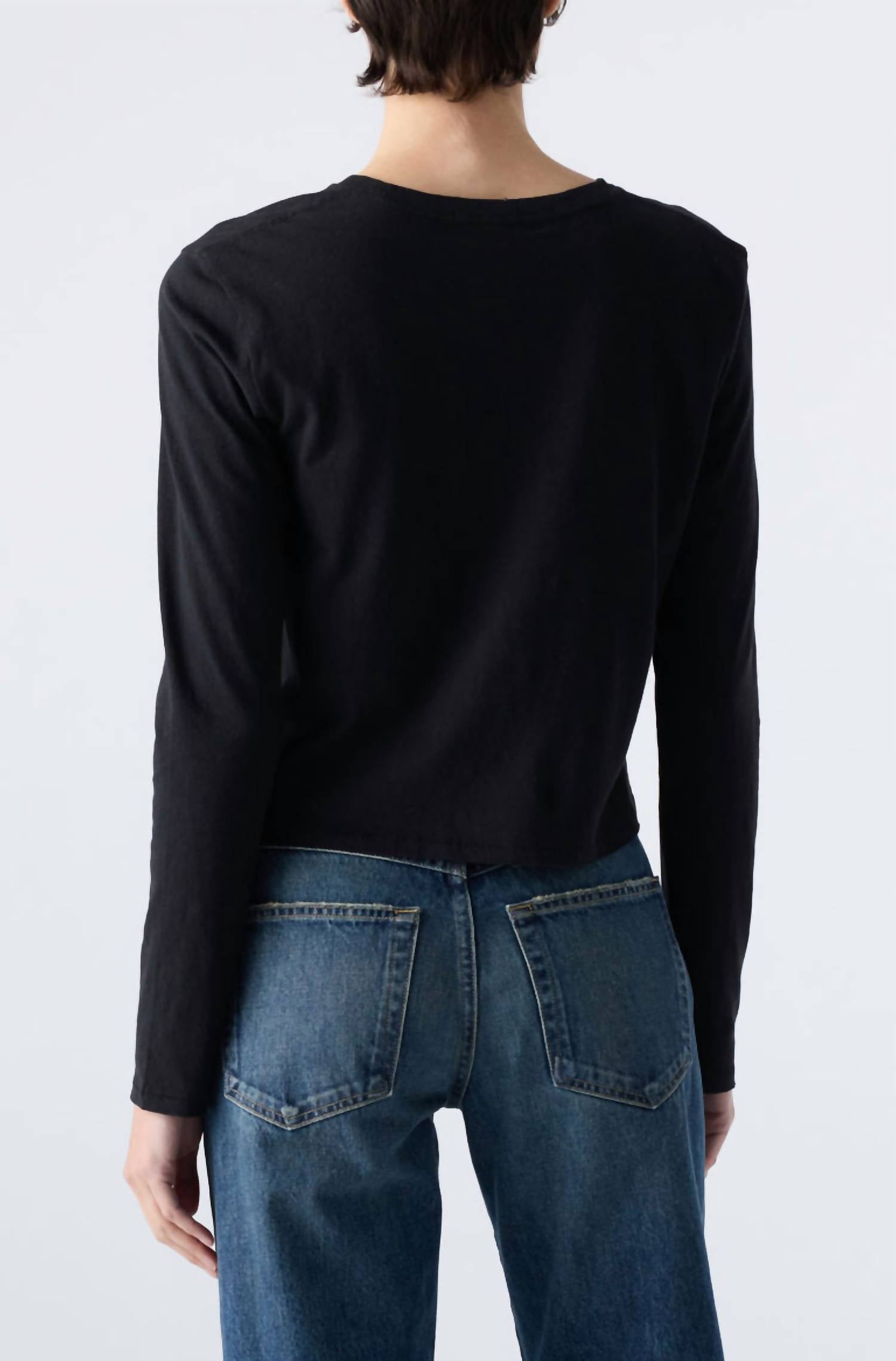 A long sleeve top you can wear with denim, skirts, well... just about anything! Introducing the Long Sleeve Babe Tee by AMO, a chic and minimalist piece in classic black. This women's tee features long sleeves and a flattering crewneck, made from a breathable 70% Pima Cotton and 30% Linen blend. With a slightly cropped length of 19.75 inches and a pull-on closure, it offers both comfort and style, perfect for a holiday party or casual outing. Expertly crafted in Peru, it is machine washable for easy care.