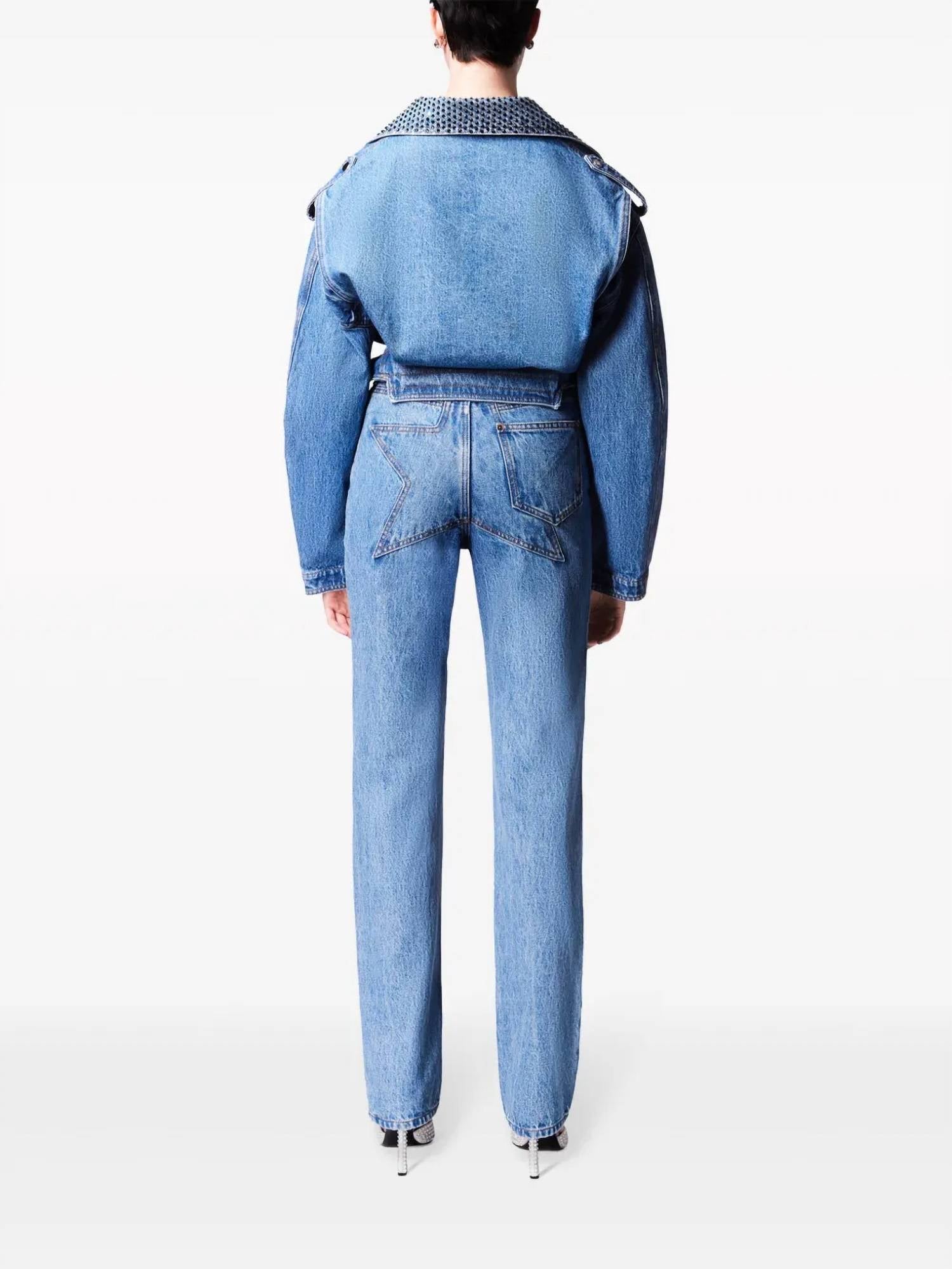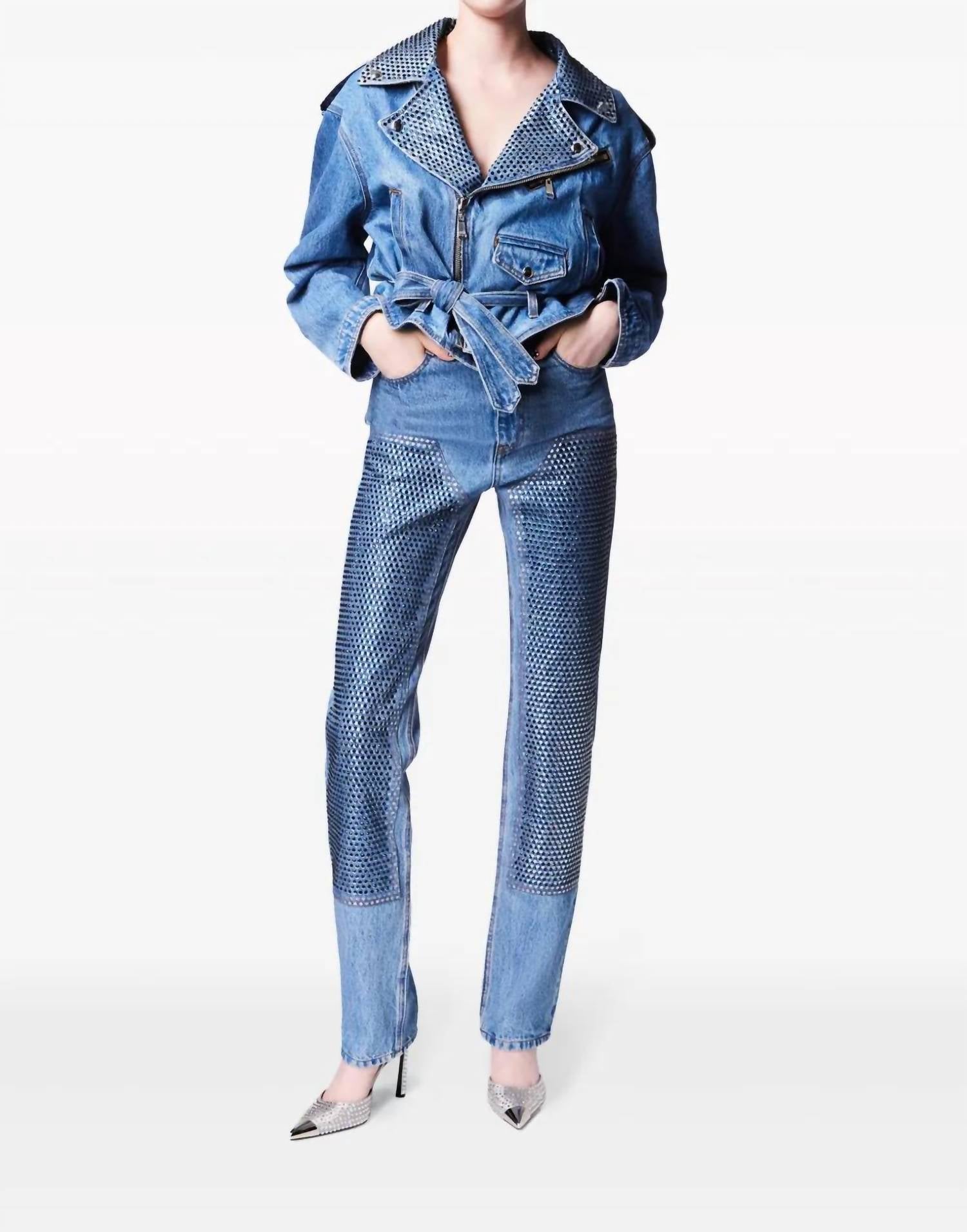 Introducing the AREA Crystal Straight Leg Jean, a stunning addition to your wardrobe with its elegant foil print and sapphire crystal embellished trim. Crafted from 100% cotton, these jeans promise both comfort and style. The button closure offers a secure fit, while the light wash and patterned design make it ideal for a dinner party. Care: Dry clean only.