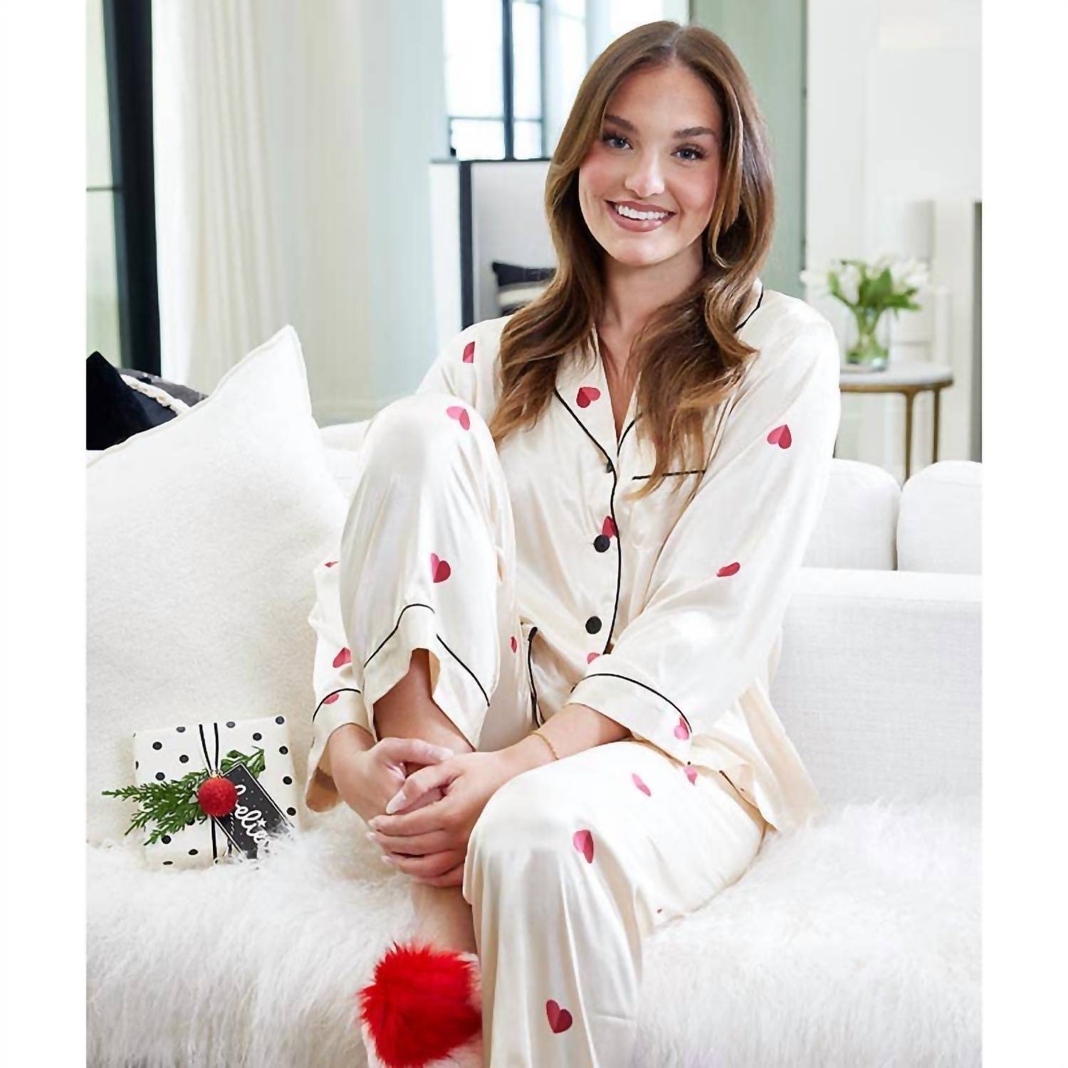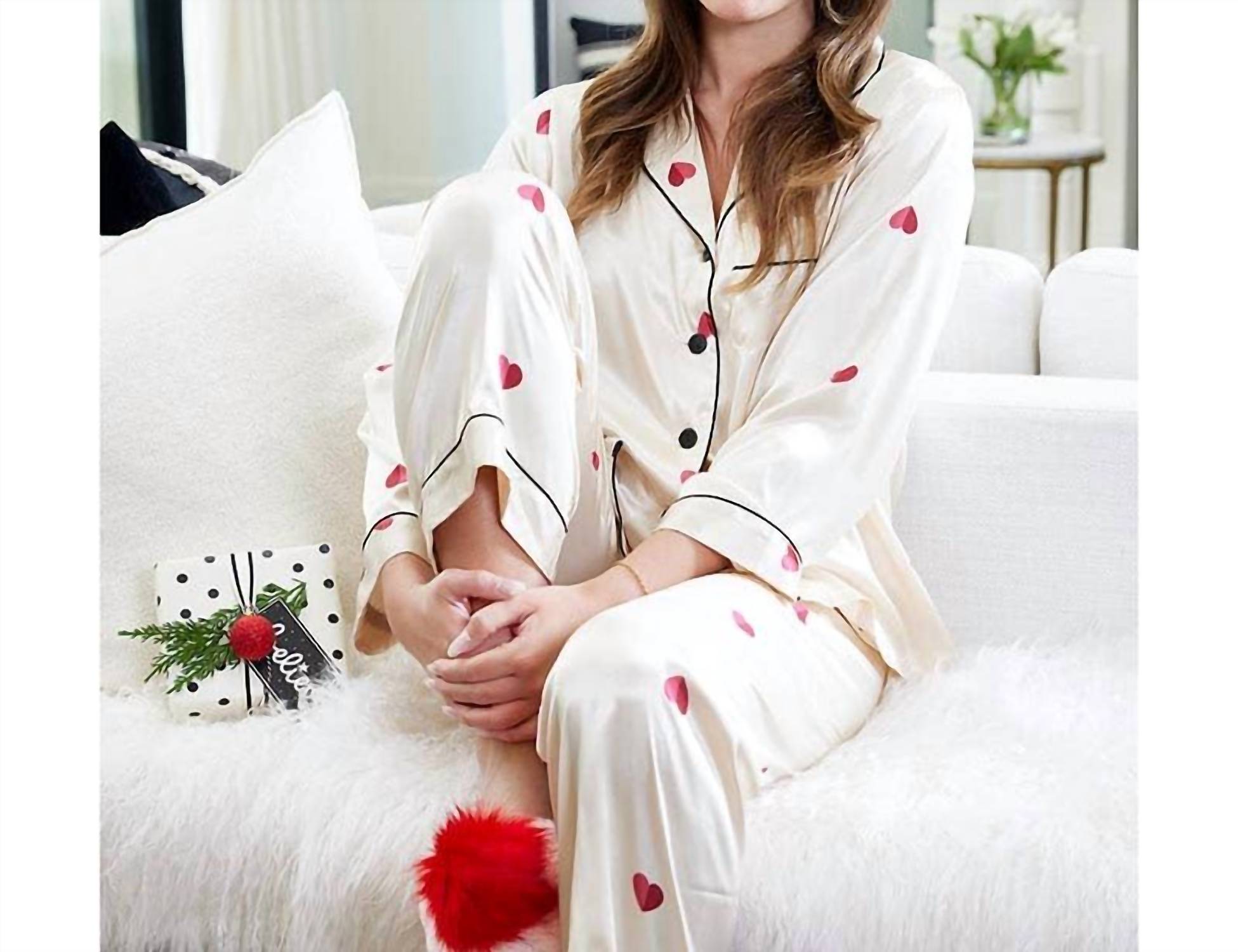 Introducing the Women's Hearts Full Length Pajama Set by Bella Sleep + Spa, the ideal choice for cozy nights and relaxed mornings. These long sleeve pajamas are crafted from 100% satin polyester for a silky and luxurious feel. Made with practicality in mind, they are machine washable and designed for easy care, simply lay flat to dry. Elevate your sleepwear collection this spring with these stylish and comfortable pajamas.