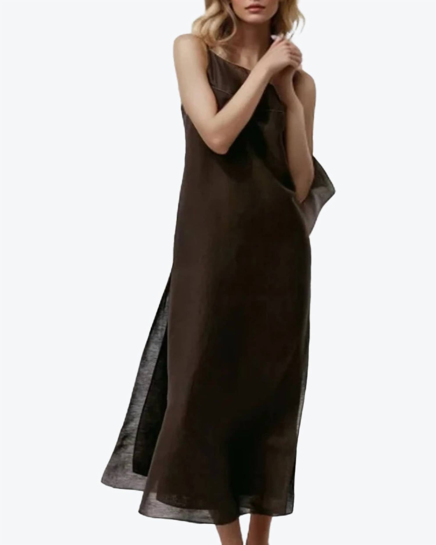 Meet the Zoe Dress by Louneste, a versatile closet hero in a rich chocolate hue. Designed with slender spaghetti straps, this dress showcases a slip silhouette and a sophisticated squareneck, perfect for effortless style. Crafted from a luxurious cotton blend, composed of 80% Cotton and 20% Ramie, this maxi dress offers comfort and elegance. Please note, this dress is closure-free to enhance its seamless design.