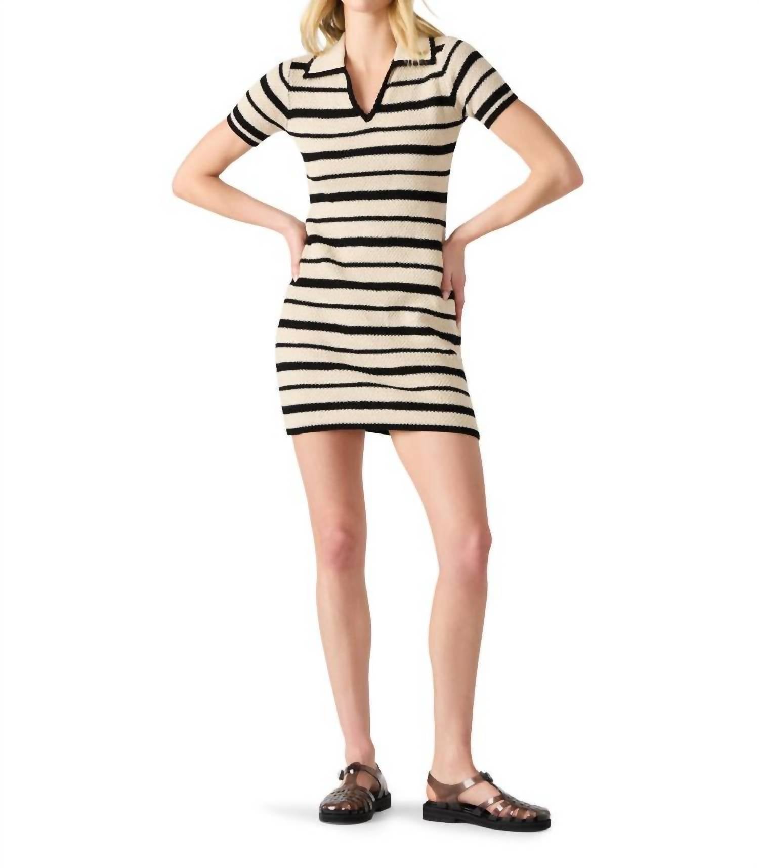 Discover the Catalina Mini Dress by Steve Madden, where casual comfort meets elevated style in a minimalist design. This women's dress features short sleeves and a classic collared V-neckline, with black and cream horizontal stripes that exude timeless appeal. Crafted from 100% cotton, the dress reaches an approximate length of 34-1/2" from center back neck to hem for a flattering mini fit. With a pull-on closure, it's perfect for summer vacations and Easter occasions. Care for this dress by hand washing and line drying to maintain its textured knit fabric.