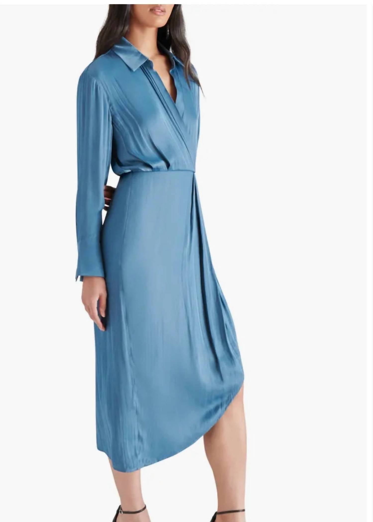 The Martina Dress by STEVE MADDEN in Ocean Blue is a captivating choice, ideal for minimalist vacation wear. Crafted from 100% polyester, this asymmetrical, textured shirtdress provides an elegant drape with its faux-wrap silhouette. Featuring long sleeves with flared one-button cuffs and a surplice V-neckline, the dress measures 43 1/2" to 48 1/2" in length. A hidden side-zip closure ensures a seamless fit. Care instructions suggest hand washing and drying flat.