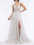 Introducing the Floral Plunging V-neckline A-line Long Gown by Vienna Prom, a masterpiece for your special occasions. Featuring sleeveless elegance, this gown is crafted in a textured multi-color design that embodies boho chic style. Its zip closure ensures a secure fit, while the intricate floral appliques enhance the plunging V-neckline and embellished bodice. Country of origin information is not provided, but rest assured the gown requires dry cleaning care to maintain its delicate allure.