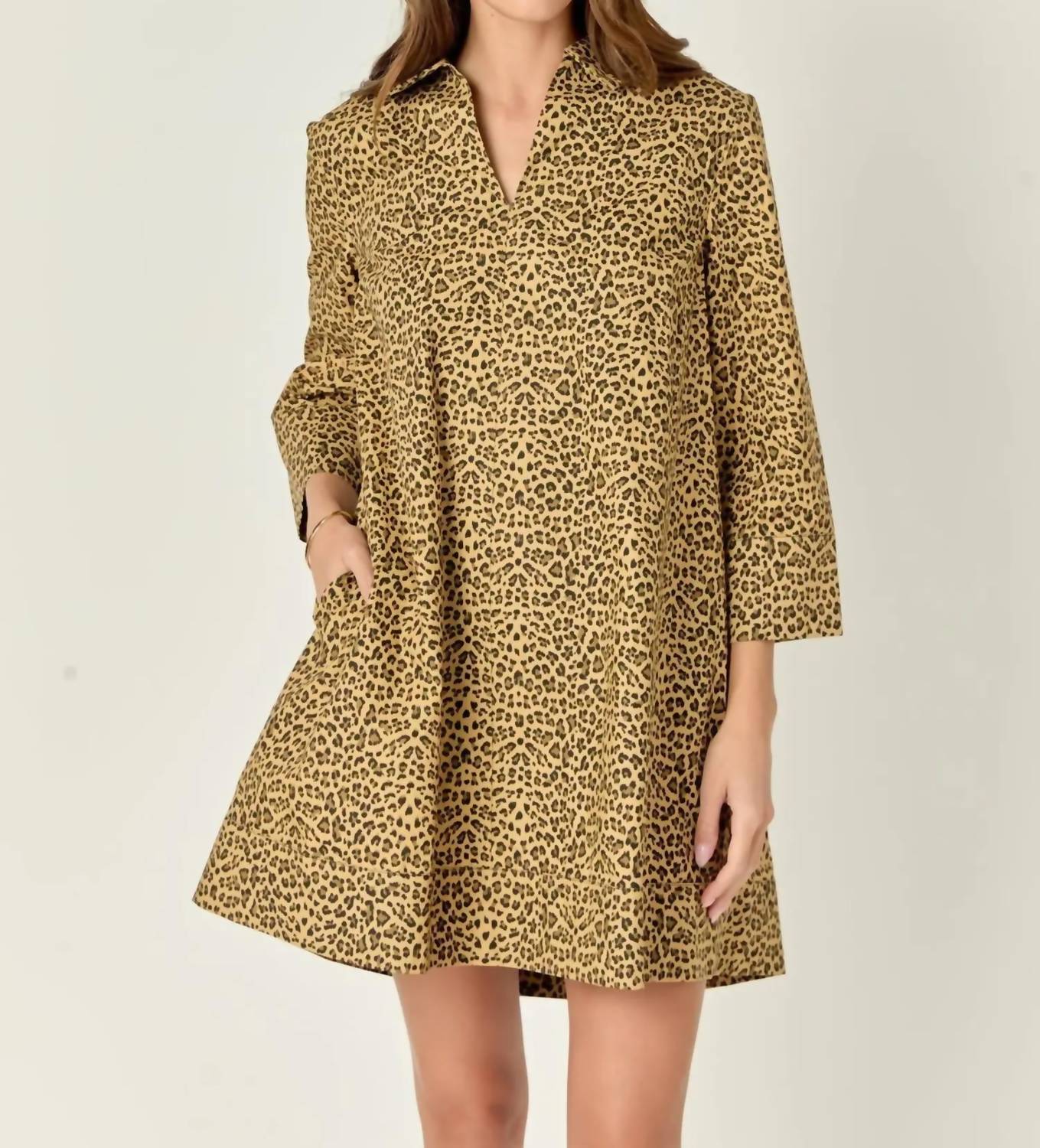 Elevate your vacation wardrobe with the Olivia Mini Dress by 2.7 August Apparel, a striking addition in a bold leopard print. This shift dress is crafted entirely from 100% cotton, ensuring comfort and breathability, and showcases a chic collared V neckline. Designed with practical pull on closure, it features three-quarter sleeves and includes handy pockets for added convenience. Care instructions are minimal: hand wash cold, iron low, line dry, and avoid bleach and tumble drying to maintain its stylish appeal.