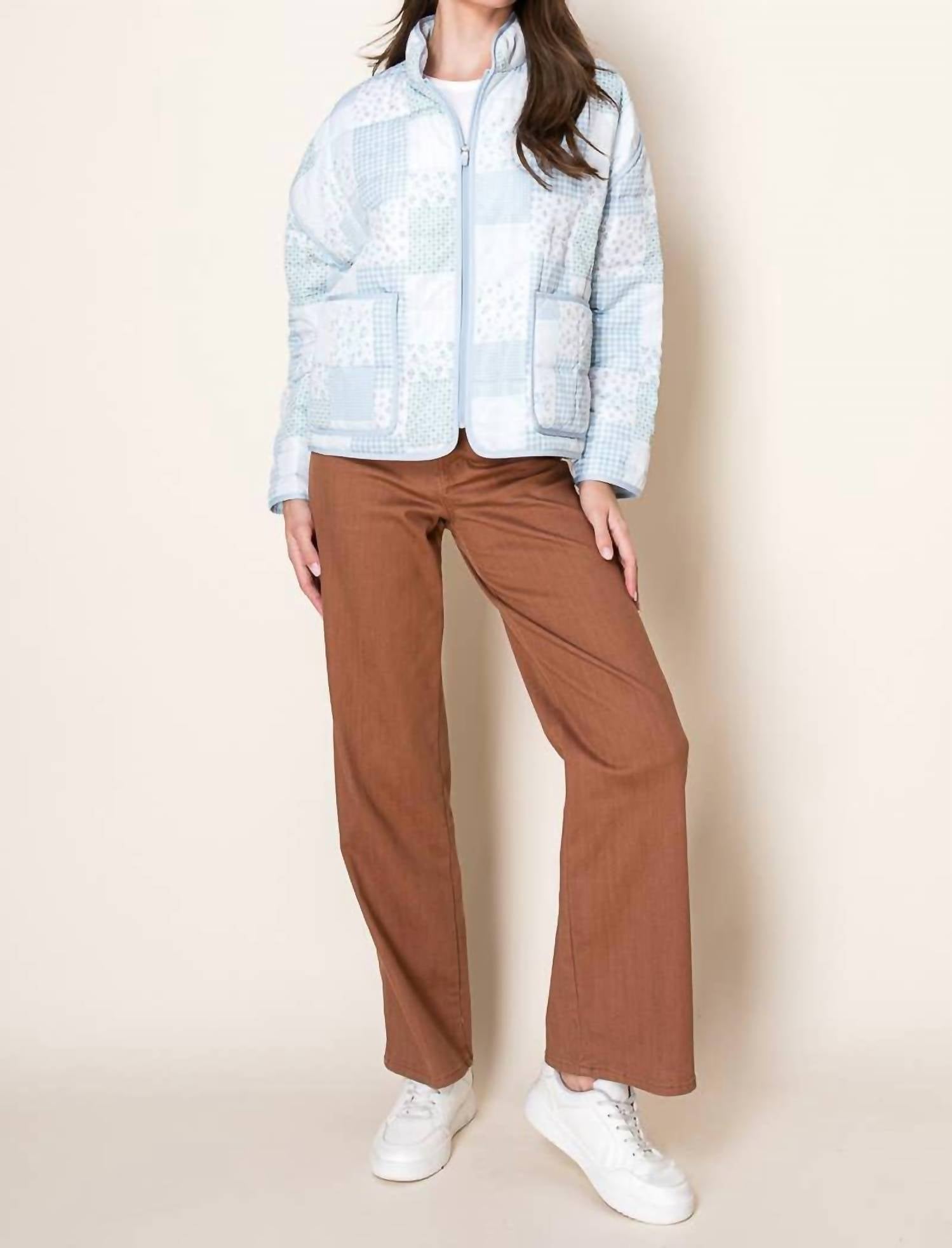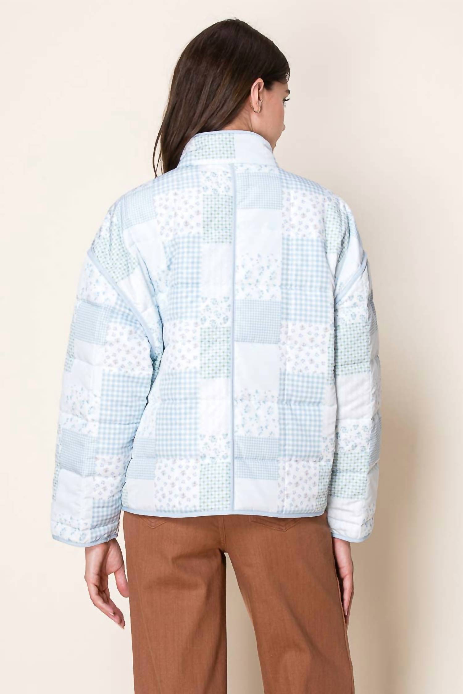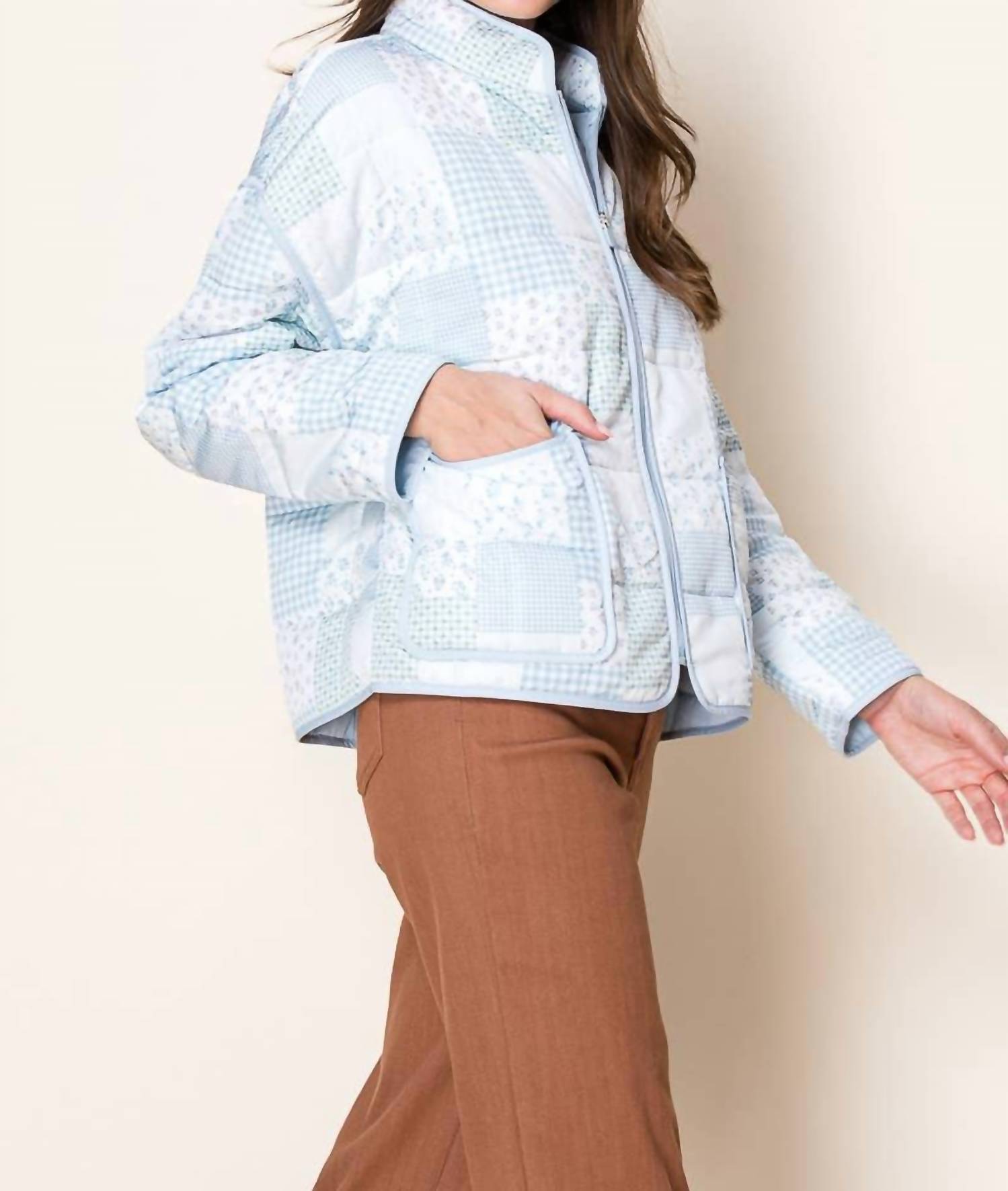 Add a touch of whimsy to your wardrobe with the Patchwork Quilted Jacket by 26 International, designed for stylish women. Featuring long sleeves and a striking flower print pattern, this jacket is crafted from a soft nylon blend. Equipped with a zip closure and a stand-up collar, it features convenient front pockets and is fully lined for added warmth. Dimensions: Bust 45", Length 24.5". Model (5'7", 34" bust, 27" waist) wears a size small.