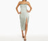 Introducing the Ivy Dress by Amanda Uprichard, a strapless sheath style in sophisticated Sea Salt. This 43-inch midi dress made from 100% silk features a soft V-neck and an invisible zip closure for a streamlined silhouette. It showcases pointed detailing at the bodice and a daring slit, enhanced by boning at the side seams for structure and smocking at the back for comfortable stretch. Care for this exquisite piece with dry cleaning only, and enjoy its chic allure for any special occasion.