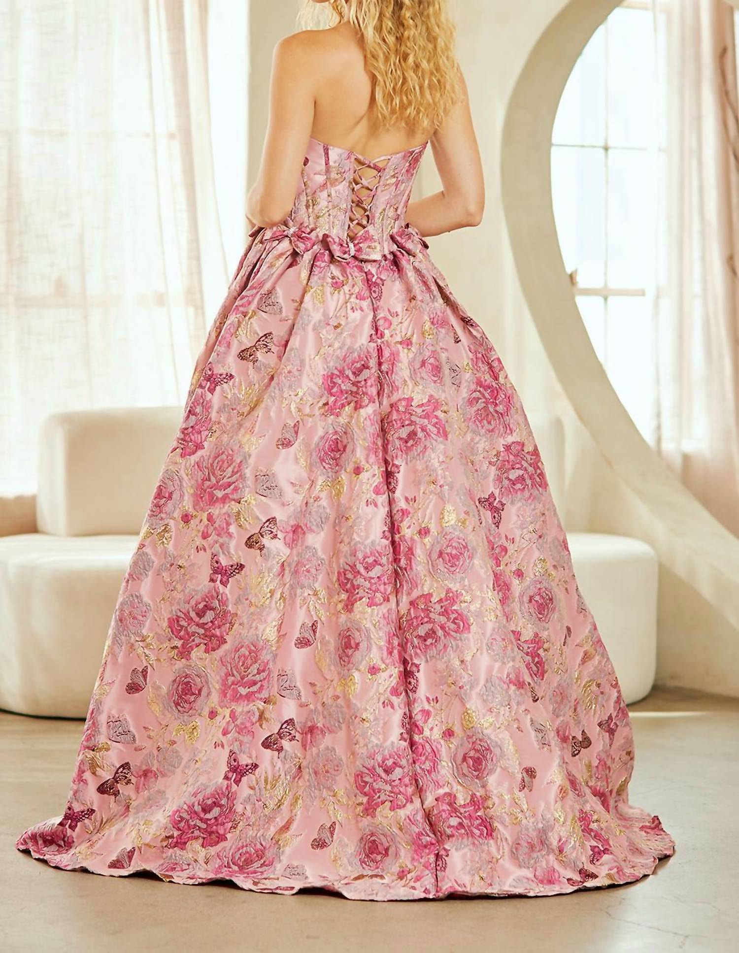 Discover the allure of the Strapless Flower Bow Detail Prom Gown by Amelia Couture, a stunning piece crafted from high-quality Polyester in an elegant pink hue. This A-line gown is a perfect choice for prom, featuring a charming floral pattern and a sophisticated scoop neckline. It offers practicality with convenient pockets and ensures a secure fit with its zip closure. For care, dry cleaning is recommended to maintain its exquisite appearance.
