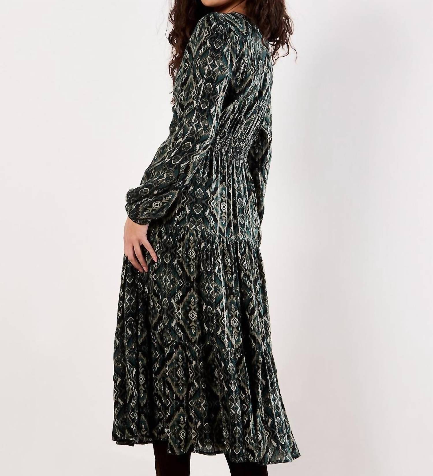 Presenting the Empire Smock Waist Tiered Dress by APRICOT, a green patterned masterpiece designed for elegance and ease. This long sleeve maxi dress features a flattering V-neckline and a kaftan silhouette, enhanced by its smock waist for a comfortable and defined fit. Closure: Pull on. Care: Dry clean only. Tailored for the modern woman who transitions effortlessly from daytime to evening events.
