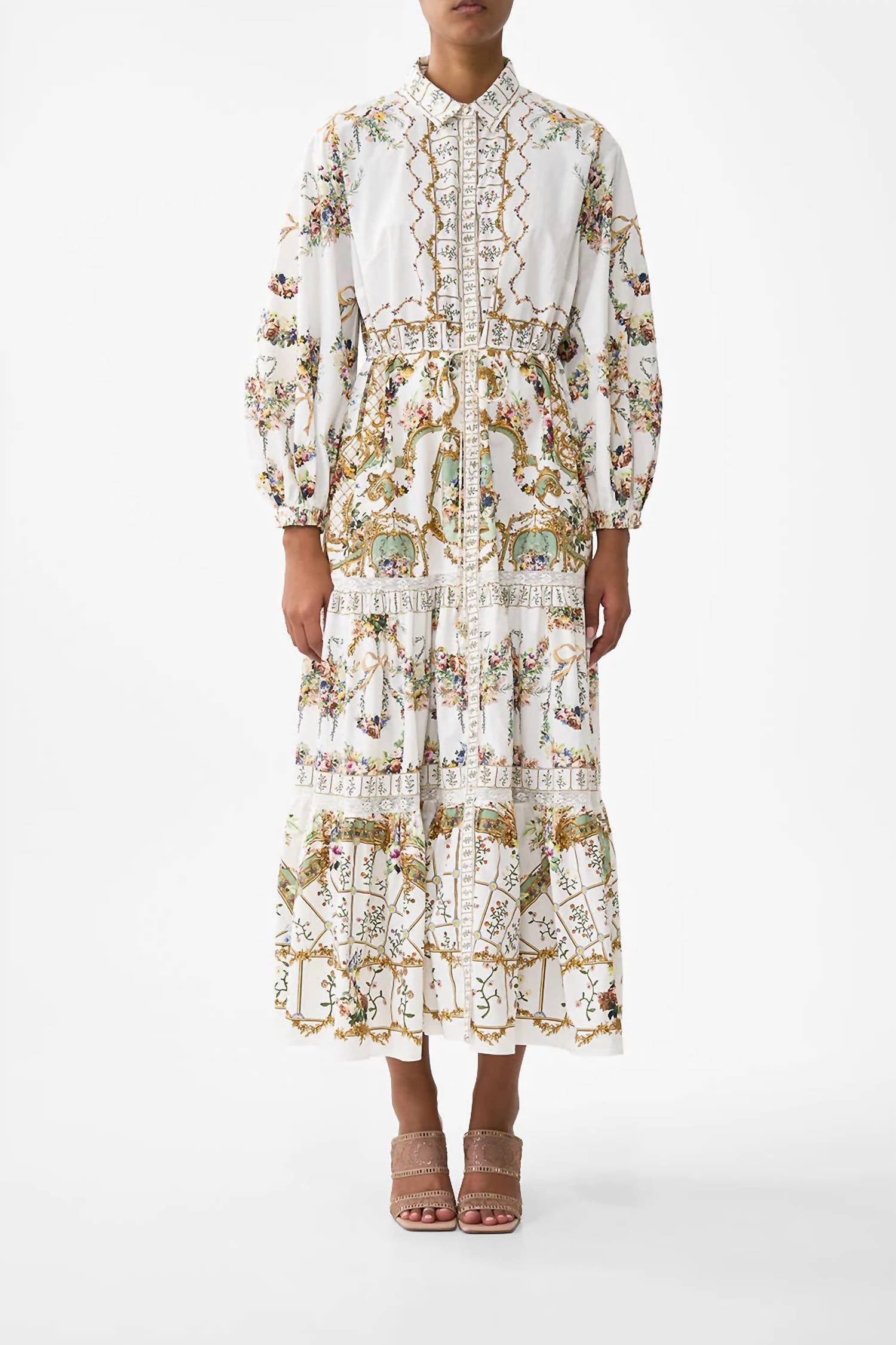 Introducing the Tiered Long Shirt Dress by Camilla, a statement piece in the captivating Dressing Room Drama floral pattern. This dress is crafted from 100% organic cotton, featuring long blouson sleeves and a button-front closure, perfectly marrying comfort with elegance. Its flowing, full-length tiered skirt, complete with a soft tailored collar and waist tie, adds a touch of drama to any springtime occasion. Originating from Camilla's menswear-inspired collection, it should be dry cleaned only to maintain its exquisite quality.