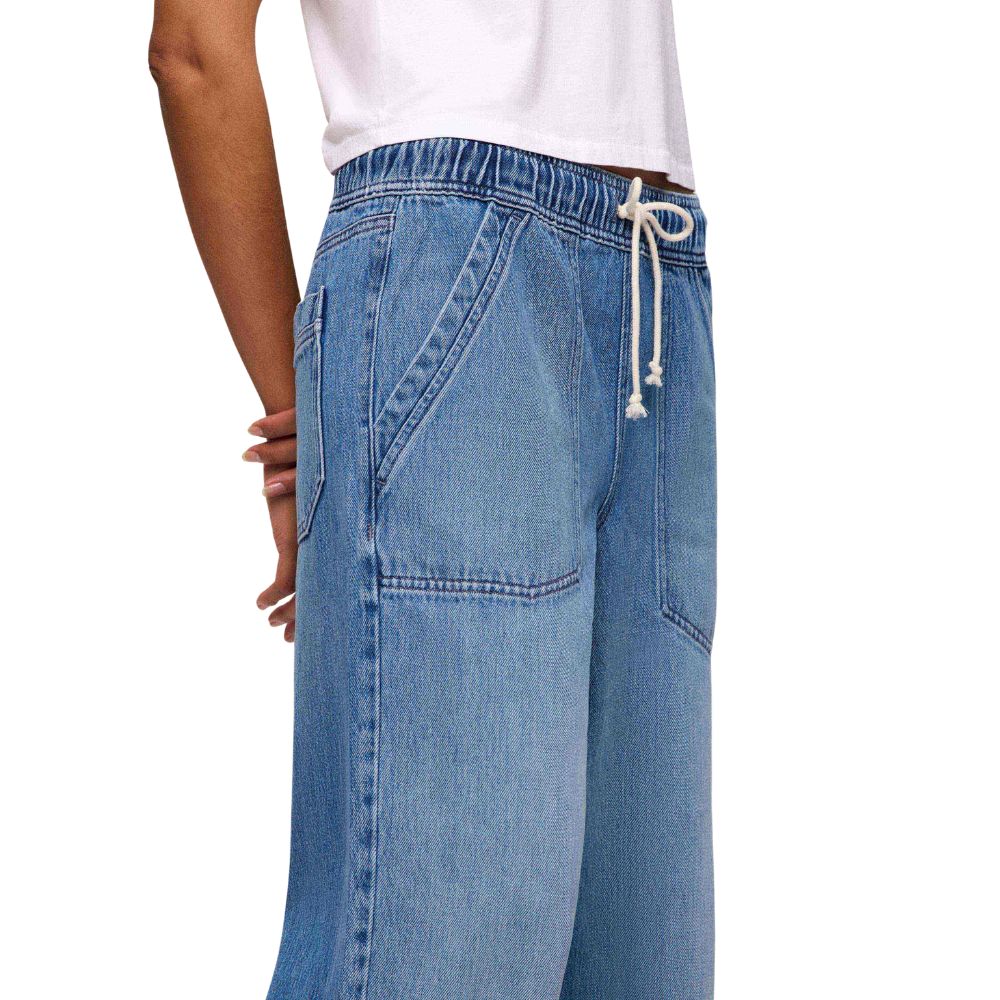 The Pull-On Jean is designed for effortless comfort with a relaxed, laid-back feel you can wear all day. Crafted from ultra-soft premium denim, these pull on jeans feature a wide leg silhouette and an elastic waistband with an adjustable drawstring for a flexible, customized fit. The mid-rise waist and relaxed leg create an easy drape that flatters without feeling restrictive, making them the perfect casual pants for women who want comfort without sacrificing style. Finished with functional patch pockets and a soft wash, these wide leg pants transition seamlessly from lounging to everyday wear.