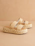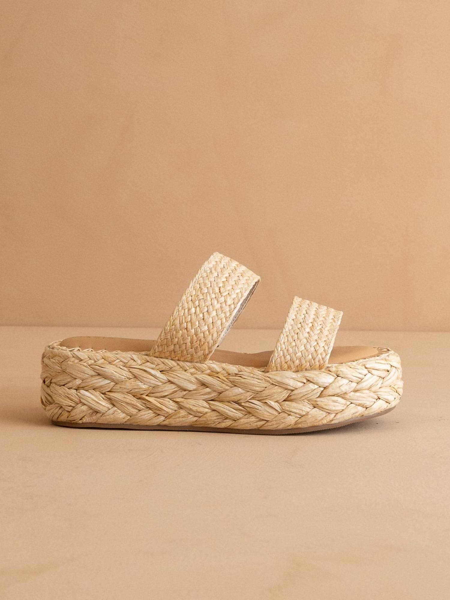 Introducing the Marley Basket Woven Double Strap Platform Slide by Oasis Society, an exquisite fusion of elegance and ease. Designed with atelier-selected raffia upper straps and completed with a DreamCloud cushioned insole, this slipper promises supreme comfort. Heel Height: 2", Front Platform: 1.5". The rubber sole exemplifies quality craftsmanship with its sturdy espadrille style. Effortlessly embrace style and comfort with these women's platform slides in a natural hue.