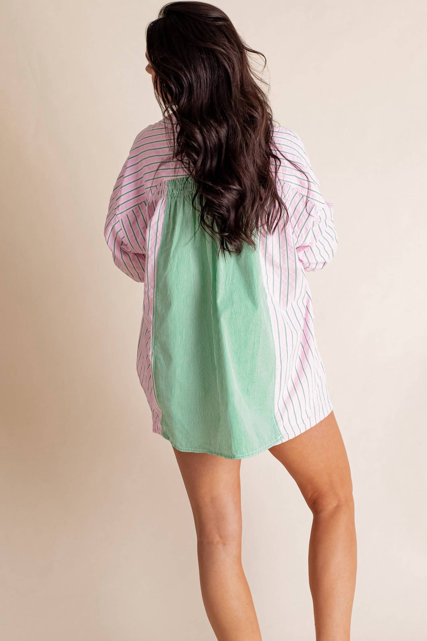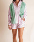 Introducing the Short And Button Up Set by Peach Love, a delightful ensemble perfect for your summer adventures. This set features a playful pink and green striped pattern with long sleeves and a collar neckline, crafted from 100% polyester with cotton contrast material for added comfort. Designed with a relaxed fit and a unique high-low hem, this Boho Chic set is ideal for St. Patrick's Day celebrations or any vacation setting. Always follow care instructions for best results, and pair it with our matching shorts for a complete look. Available in sizes small through large.
