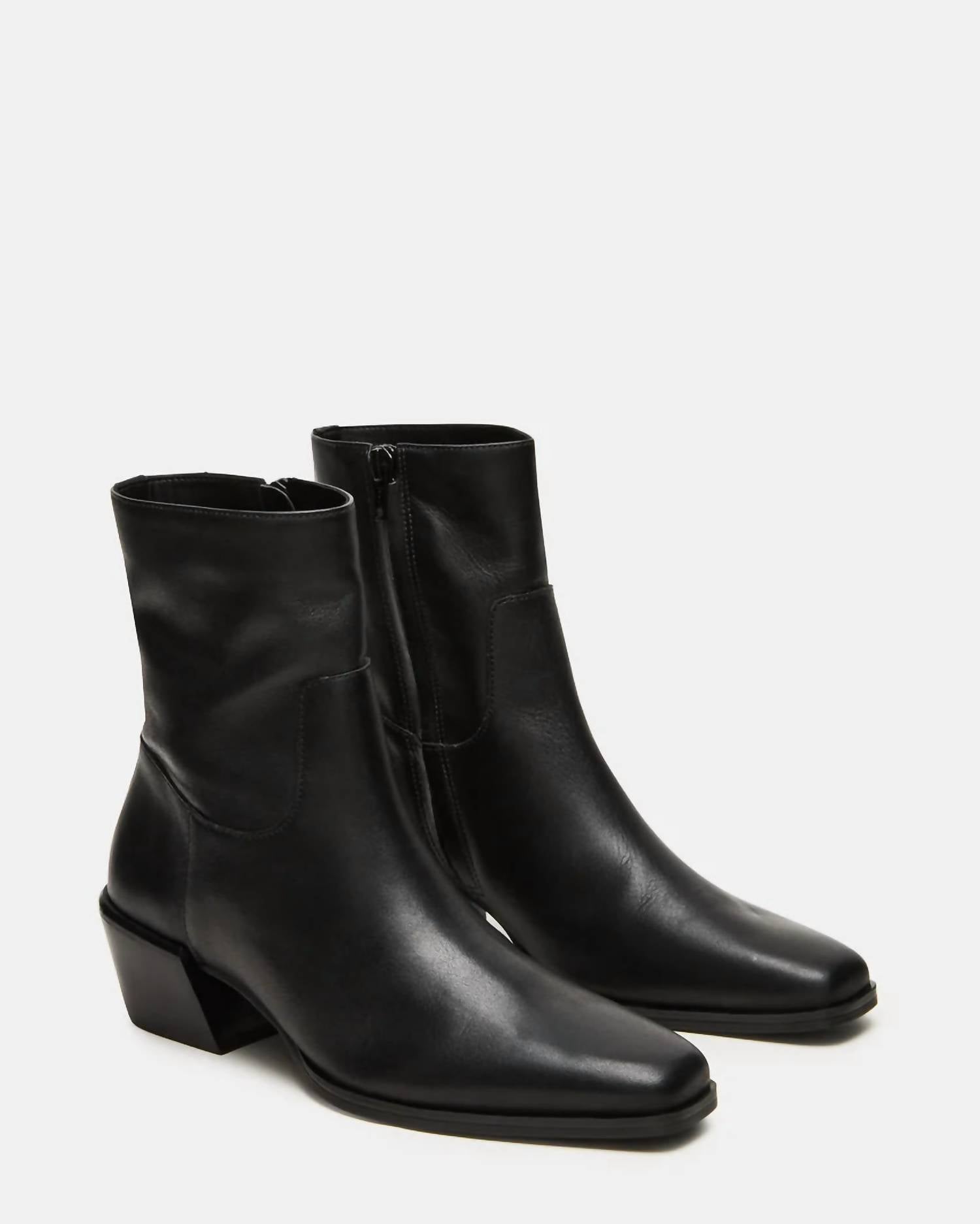 Elevate your footwear collection with the Women's Daney Leather Boot by Steve Madden, a striking blend of edgy attitude and comfortable style in classic black. These boots feature a leather upper with a squared toe and a fabric lining, secured with a convenient zipper closure. Enjoy the sturdy block heel which stands at an approximate height of 2 inches, complementing the synthetic outsole for durability. Perfect for a vacation or streetwear look, these boots boast an approximate 6'' shaft height and a 9'' circumference, seamlessly transitioning your attire from casual to standout.