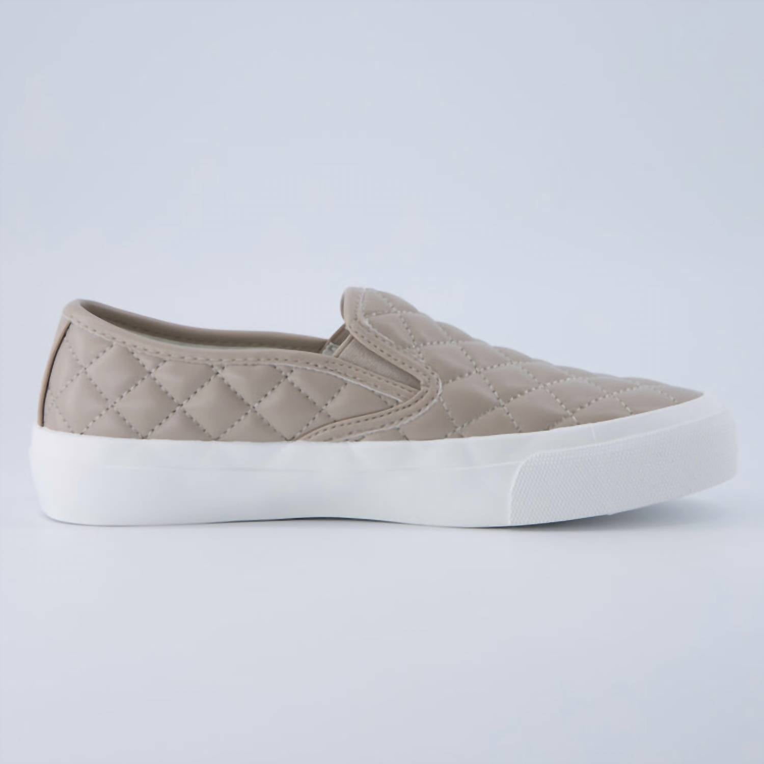Cute, functional, and comfortable. These sneakers check all the boxes. Introducing the Cushionaire Faze Women's Quilted Slip-On Sneaker, a fusion of style and comfort in a sophisticated natural hue. Designed with a sleek faux leather upper, this sneaker features a diamond quilted pattern and stretch gore panels for easy wear. A memory foam footbed pampers your feet throughout the day, while a durable rubber outsole ensures reliable grip. Heel Style: Flat Heel (1" & Under). Ideal for spring escapades and versatile enough for pairing with everything from leggings to denim.