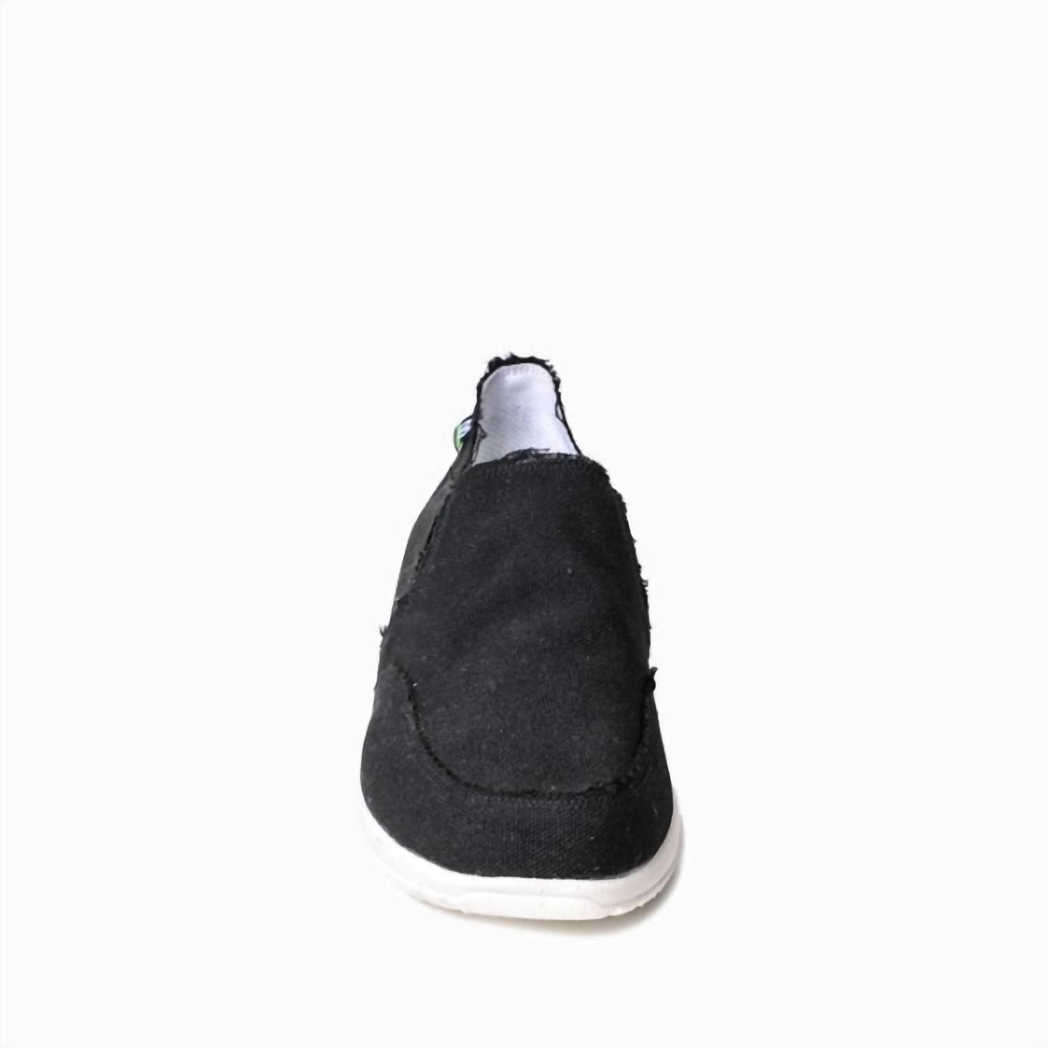 Discover the Women's Expanse Canvas Slip-On Shoes by Minnetonka, designed for everyday wear with comfort and style in mind. These black sneakers feature a breathable Eco Canvas upper with frayed fabric finish and a round toe. Enjoy the lightweight feel and easy fit provided by the twin gore and signature Flex3 sugarcane EVA white outsole. Composition includes a cushioned memory foam insole and Ecomesh lining. Origin: Imported.