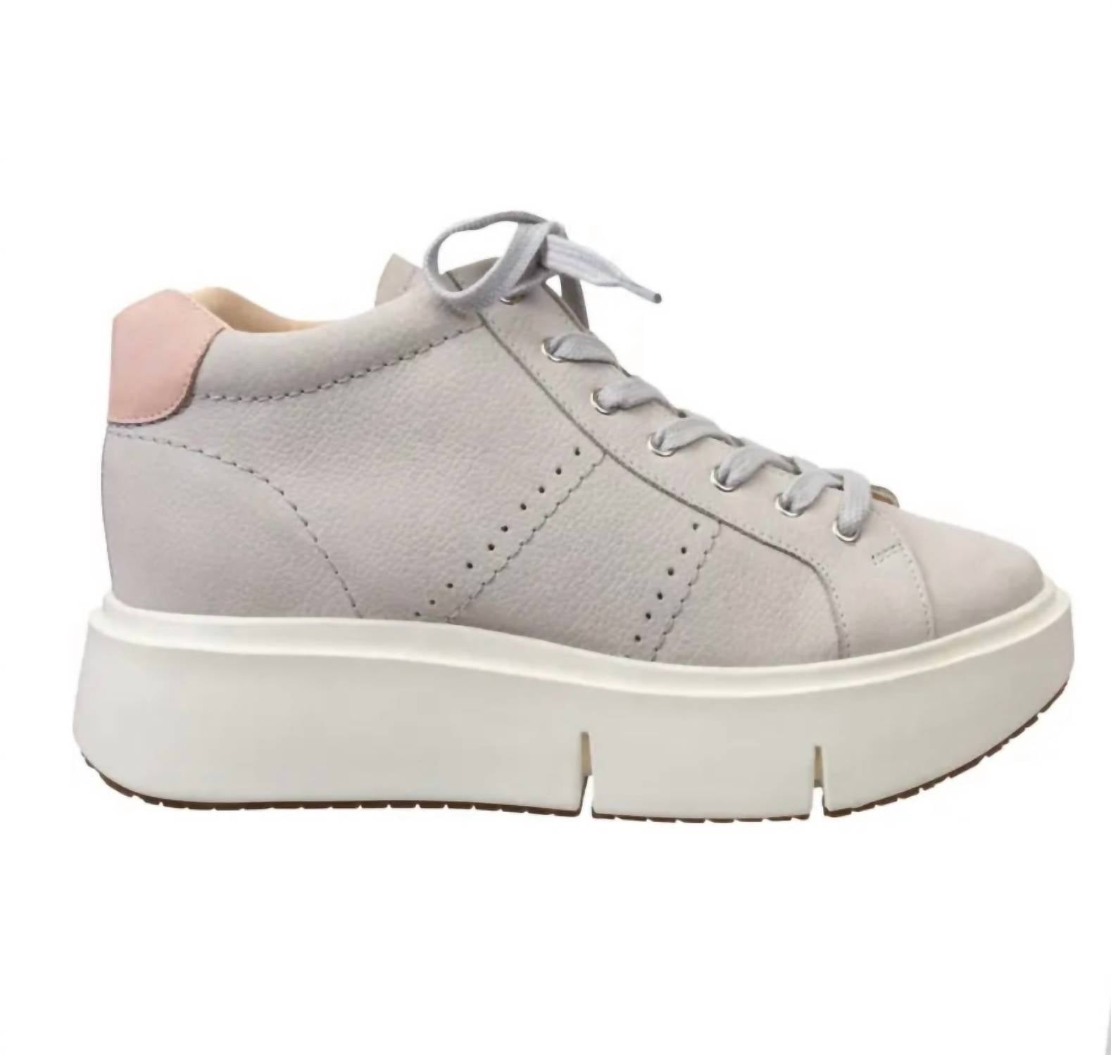Get your daily steps in with these adorable sneakers. Step up your weekend style with the Women's Essex High-top Sneakers by Naked Feet, crafted in a sophisticated Mist color. These sneakers feature a leather upper, textile lining, and rubber sole, complemented by a removable, cushioned insole with arch support for enhanced comfort. The 1 3/4" heel combined with a chunky platform evokes a nostalgic flair, ideal for contemporary women on the go. With a round toe design, it's the perfect blend of artisanal craftsmanship and modern sophistication.