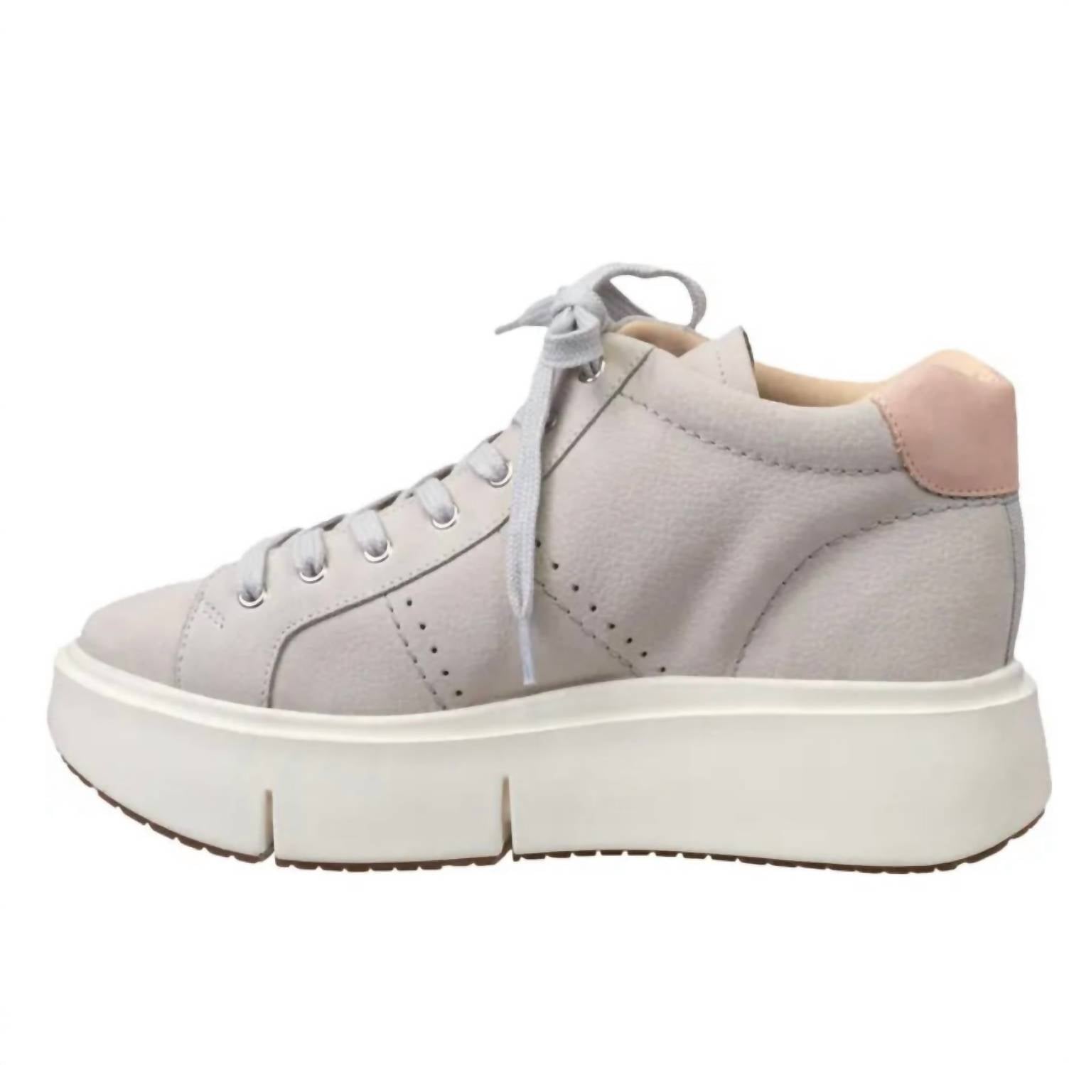 Step up your weekend style with the Women's Essex High-top Sneakers by Naked Feet, crafted in a sophisticated Mist color. These sneakers feature a leather upper, textile lining, and rubber sole, complemented by a removable, cushioned insole with arch support for enhanced comfort. The 1 3/4" heel combined with a chunky platform evokes a nostalgic flair, ideal for contemporary women on the go. With a round toe design, it's the perfect blend of artisanal craftsmanship and modern sophistication.