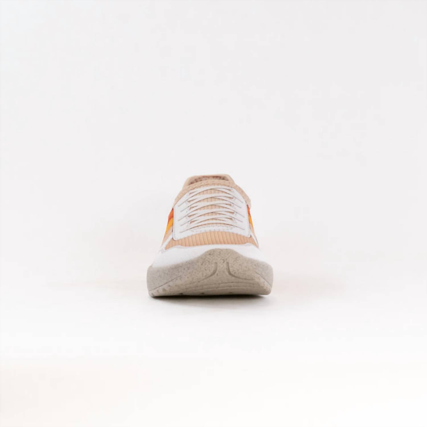 When fashion and function come together seamlessly. Introducing the Women's Court Sneakers by PSUDO in Mojave/multi, crafted for both style and sustainability. These sneakers boast a lightweight Repreve fabric, machine washable and made from recycled materials, offering breathable and sweat-wicking comfort. Designed with printed laces for a stylish touch and featuring soft cushioning with anatomically correct arch support for optimal all-day comfort. Enjoy the convenience of an anti-microbial insole and the option to wear with or without socks.