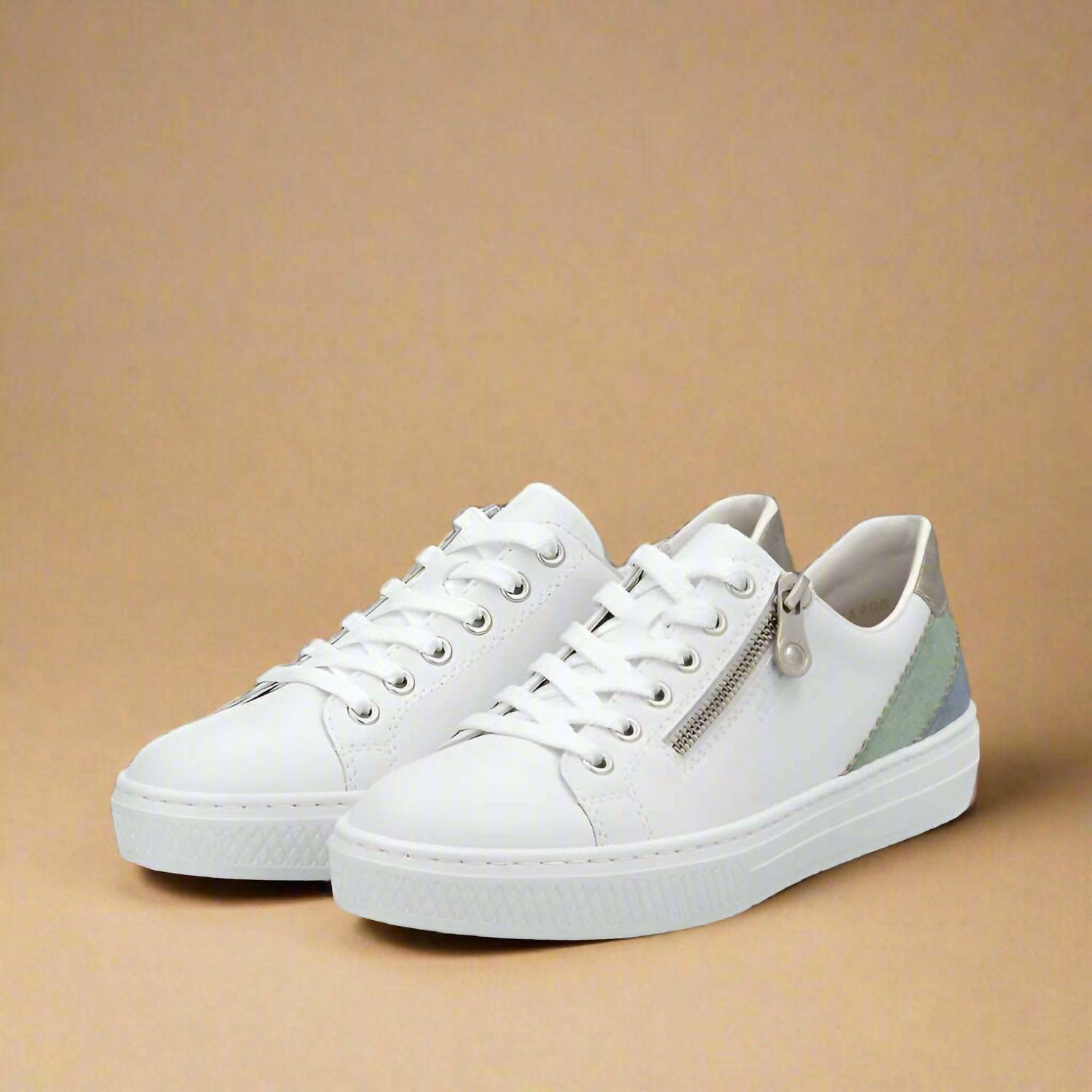 Cute, functional, and comfortable. These sneakers check all the boxes. Introducing the RIEKER Women's L5900 Sneakers, a perfect blend of comfort and style in a striking White Mint Blue colorway. These narrow-fit sneakers are crafted from premium leather and designed with laces and a zipper closure for easy wear. Ideal for summer streetwear and holiday parties, these shoes feature a flat heel under 1", making them a versatile choice for both travel and everyday adventures. Enjoy the comfort and chic appeal of these sneakers, perfect for adding a touch of elegance to your casual outfits.