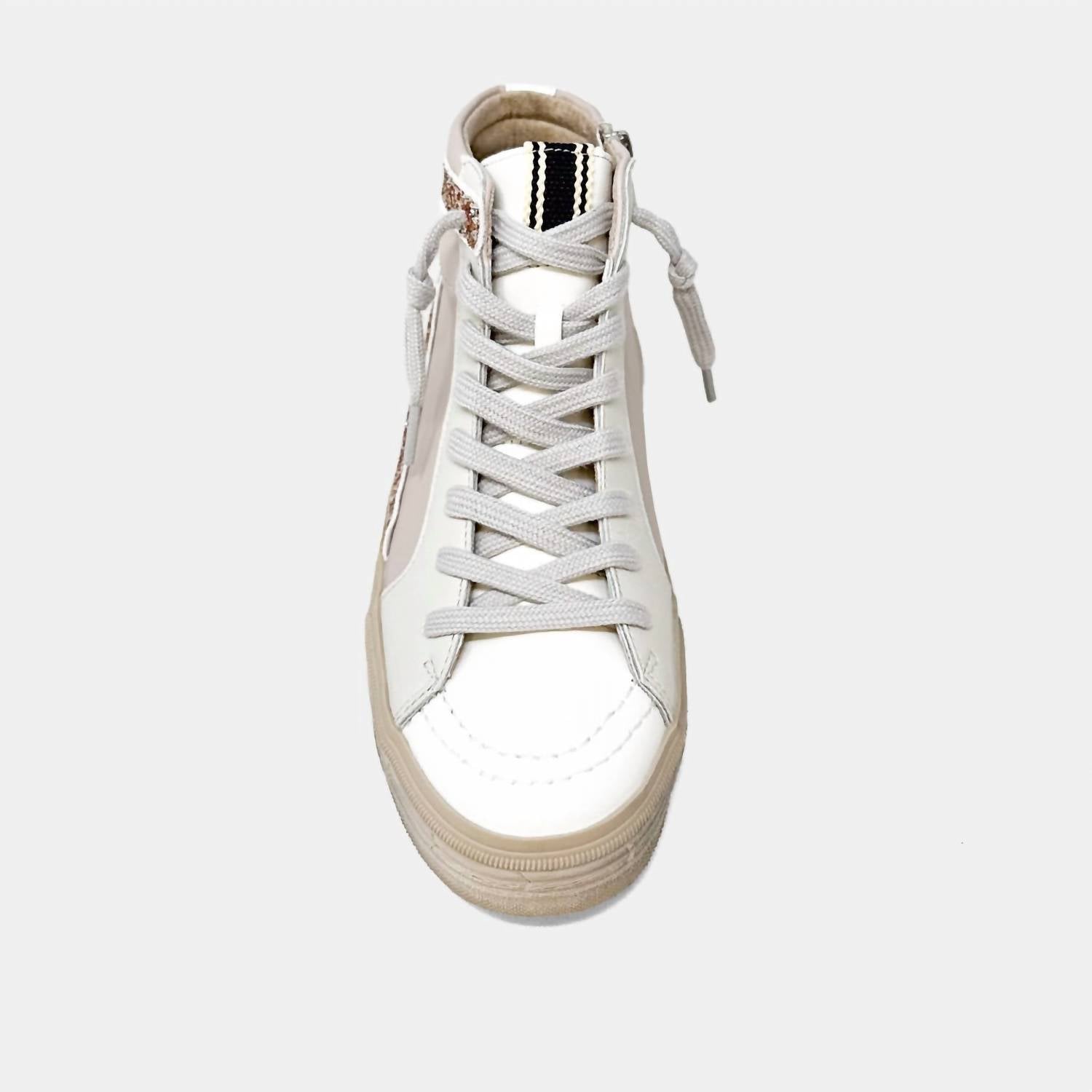Cute, functional, and comfortable. These sneakers check all the boxes. Step up your sneaker game with the Women's Rooney Sneakers by SHU SHOP, a stylish twist on vintage basketball footwear. Crafted in a unique Mushroom hue, these high-tops feature a striking mix of faux leather, glitter, and suede panels adorned with colorful embellishments. Their round toe design ensures comfort and versatility, making them a must-have addition to any wardrobe.