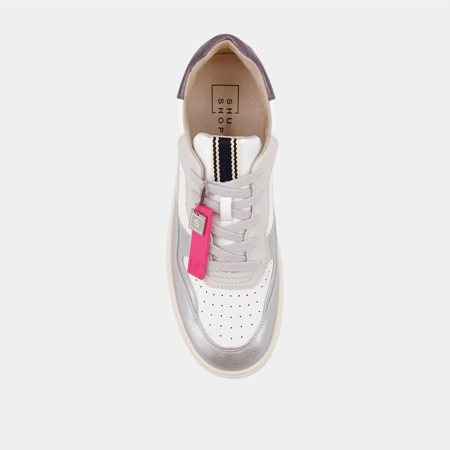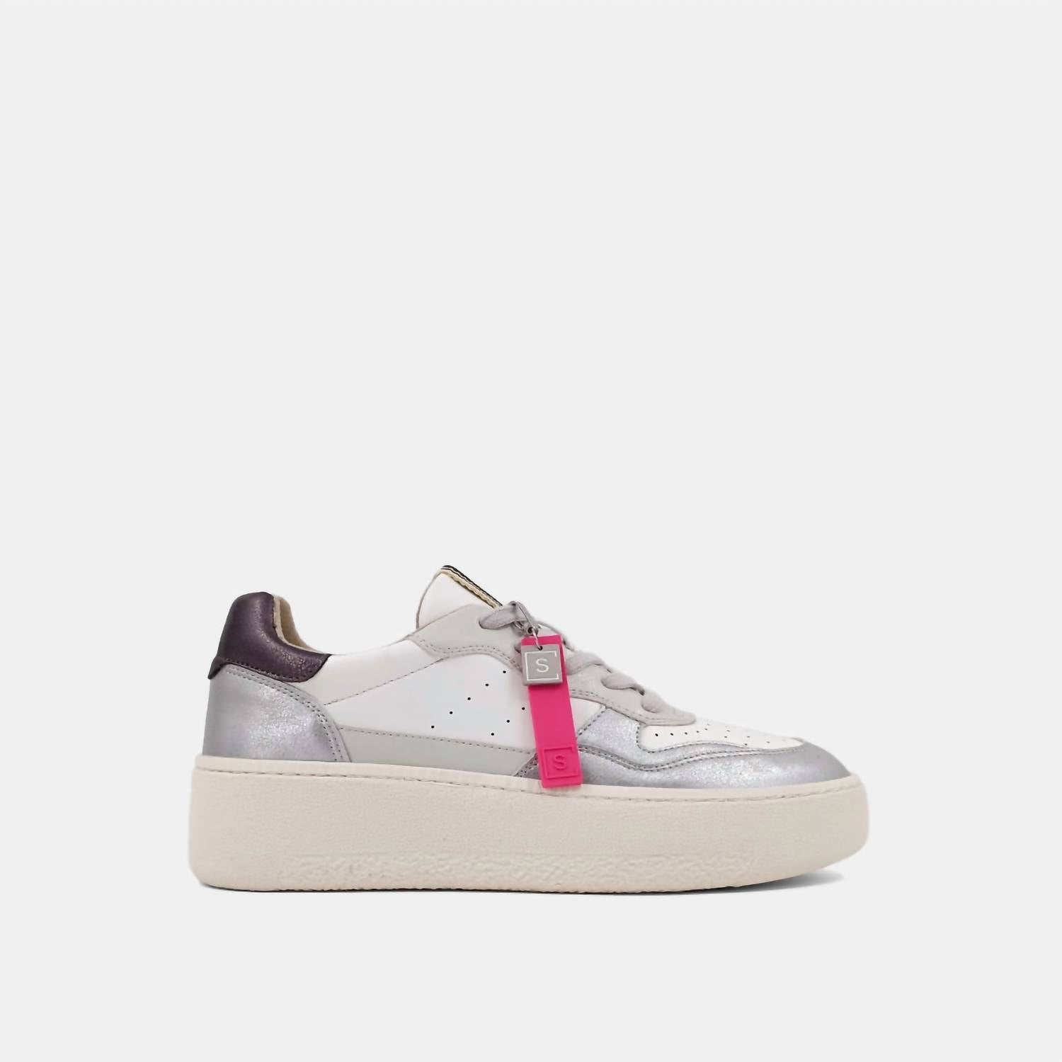 Introducing the Women's Sheena Sneakers by SHU SHOP, where trendsetting style meets everyday comfort. Crafted from high-quality faux leather and suede, these sneakers boast eye-catching silver laminated accents and a modern pendant tag featuring the brand icon. The durable rubber sole offers a height of approximately 5cm, ensuring a blend of style and comfort. With a round toe design, these sneakers are perfect for the fashion-forward woman seeking a chic and comfortable look.