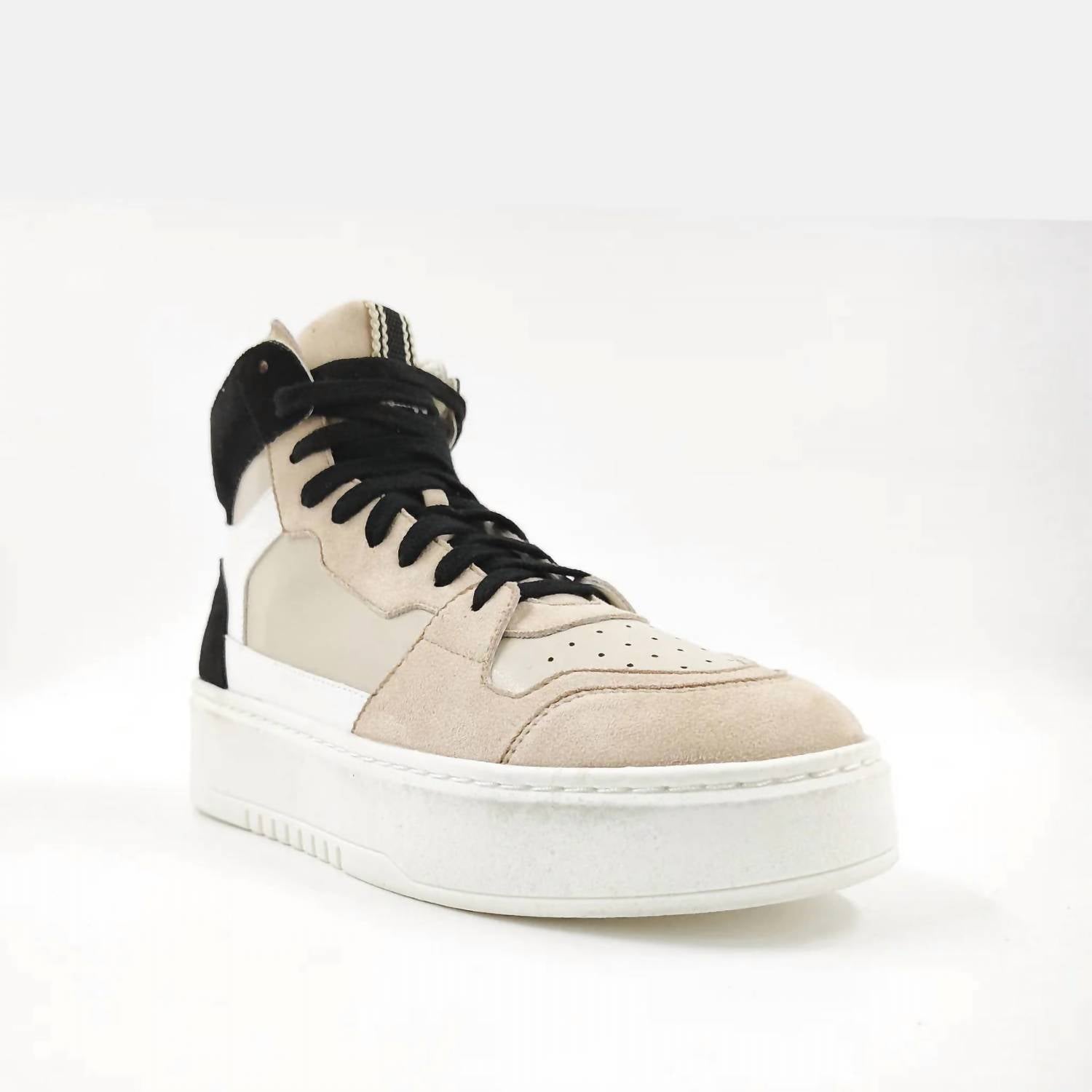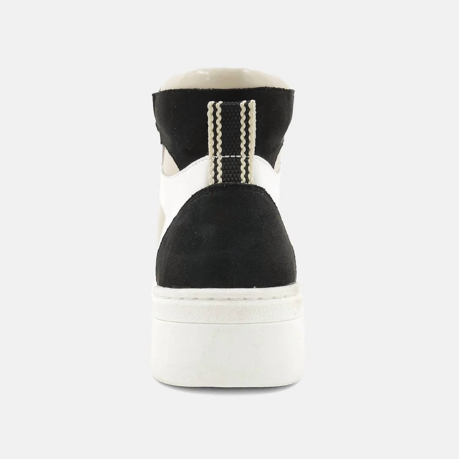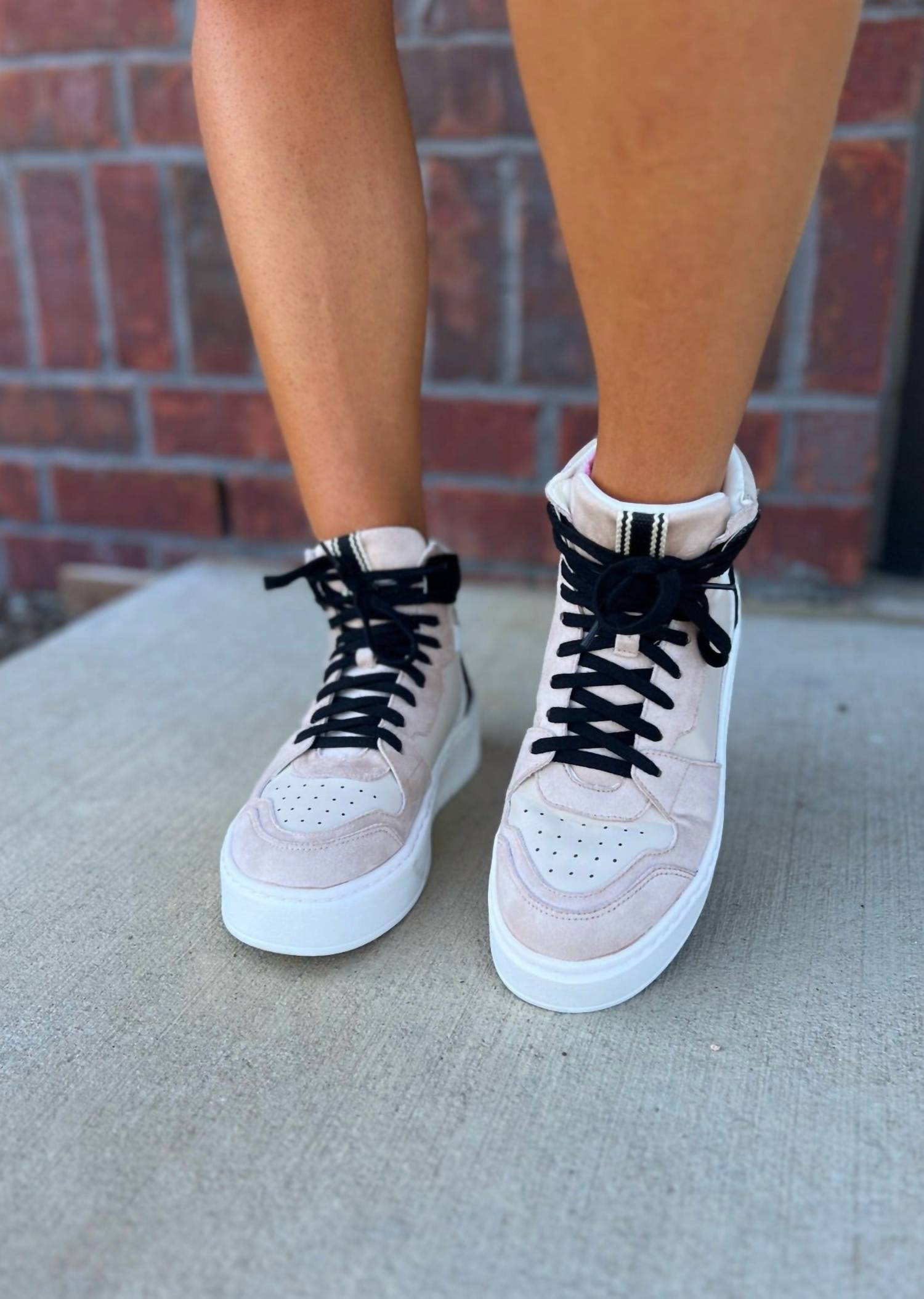 Introducing the Women's Sinead High Top Sneakers by SHU SHOP, where style meets comfort with a sleek nude and black design. Crafted from faux leather, these sneakers feature a platform sole and round toe for functionality and flair. The low heel height (1 1/4"-2") offers a flat, supportive feel, making them ideal for athleisure activities or fitness workouts. Perfect for elevating your summer style, these trendy high tops make a great addition to your Christmas wardrobe.