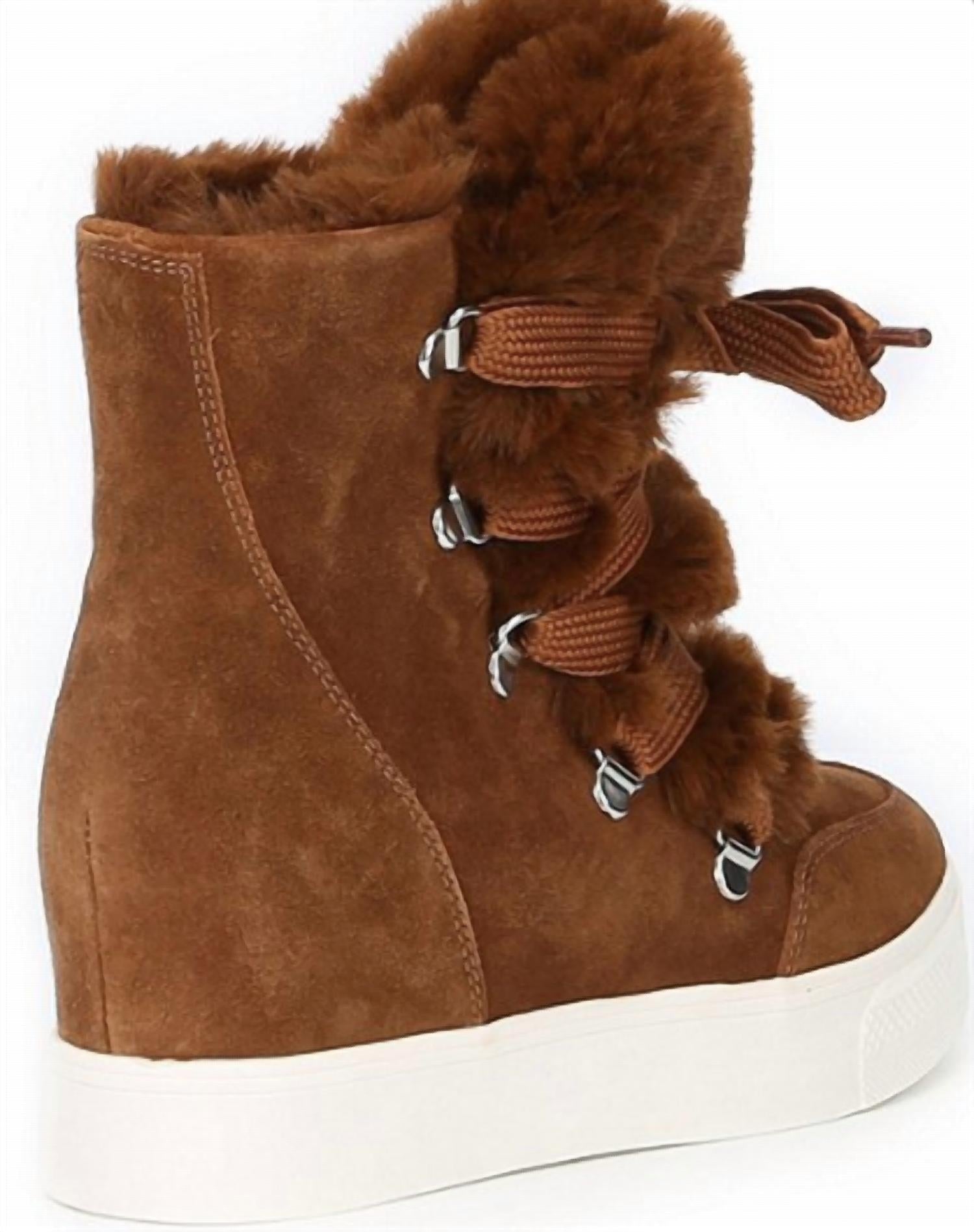 Cute, functional, and comfortable. These sneakers check all the boxes. Experience ultimate comfort and style with the Women's Suede Faux Fur Lined Wedge Lace Up Sneaker by Steve Madden, perfect for holiday parties. Featuring a chic lace-up design, these sneakers have a platform heel for a subtle lift and a round toe for added comfort. Lined with soft faux fur, these brown sneakers are ideal for the summer season. Crafted with attention to detail, they are a must-have addition to any fashion-forward wardrobe.