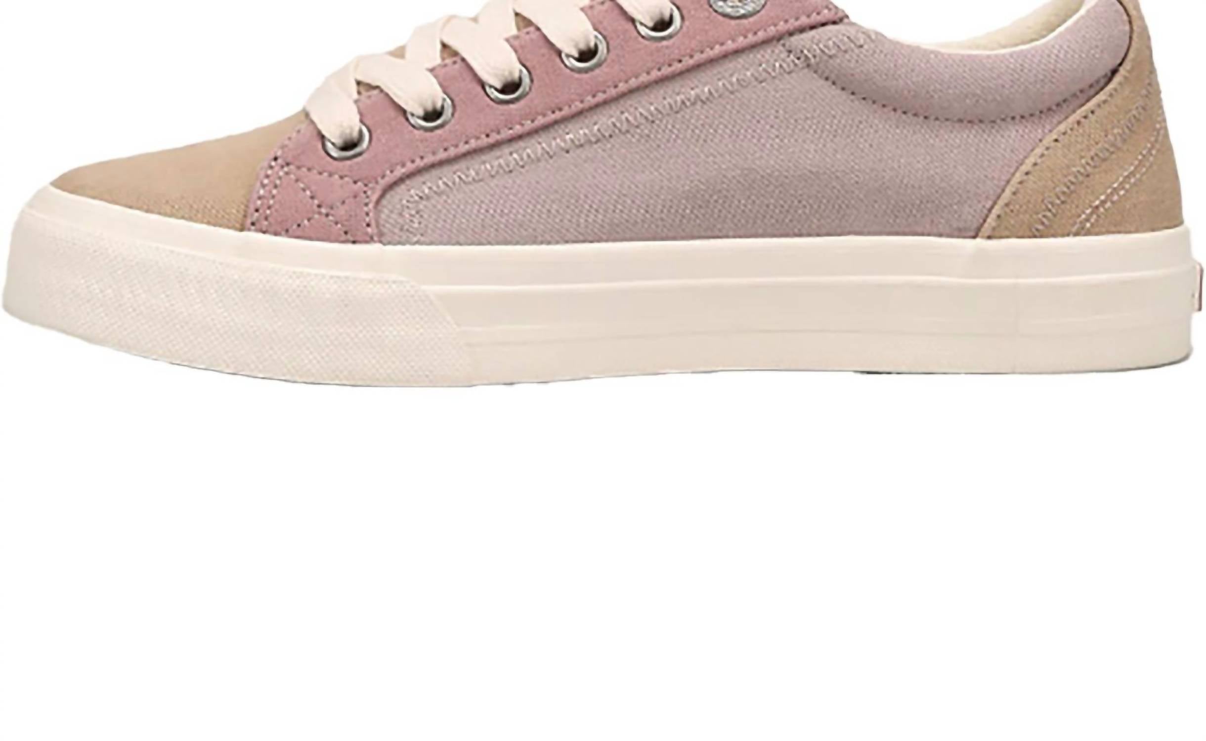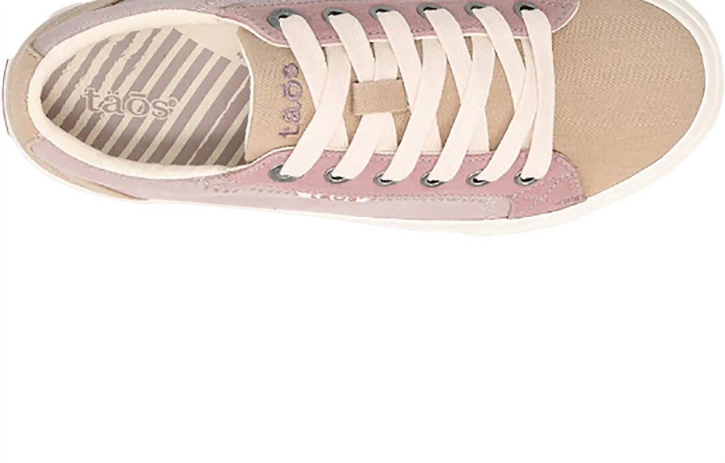Get your daily steps in with these adorable sneakers. Elevate your casual style with the Women's Plim Soul Canvas Lace Up Sneakers by Taos, now available in a chic Tan/Dusty Rose Multi hue. Crafted from durable canvas, these sneakers offer exceptional comfort with their Curves and Pods removable footbed, complete with Cool Recovery Foam and a cooling gel layer for all-day ease. Designed with a molded, contoured polyurethane footbed and flexible rubber outsole, they provide impeccable arch and metatarsal support. Featuring a lace-up closure and a minimalist trend, these flat (1" & under) sneakers with a round toe are perfect for summer travel, recommended to be worn in a medium shoe width; consider ordering half a size up for the best fit.