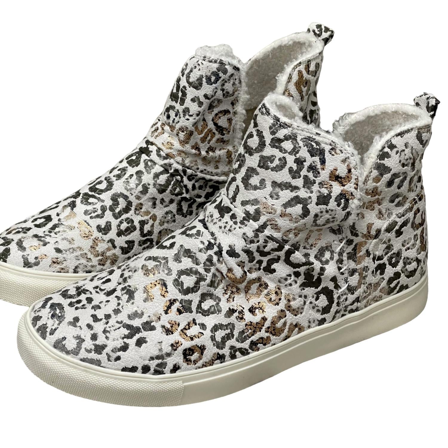Cute, functional, and comfortable. These sneakers check all the boxes.High top slip-on sneakers with a round toe and padded insole, featuring a Sherpa lining for added warmth. Designed with a side zipper closure and adorned in leopard prints.