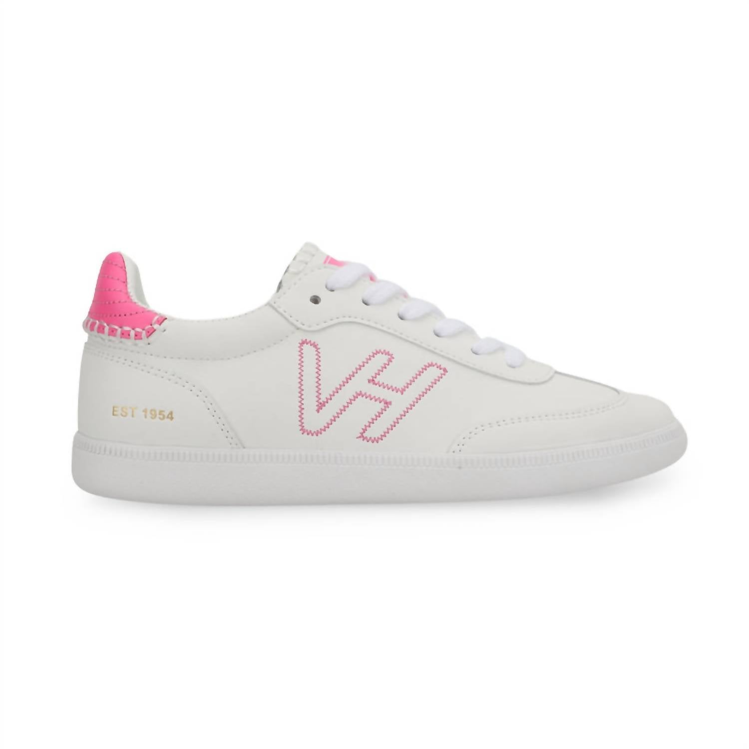 Get your daily steps in with these adorable sneakers. Step into bold style with the Women's Crisp 4 Sneaker by Vintage Havana, a chic addition to any footwear collection. This low-top sneaker in white features a neon pink outlined VH logo, offering a playful contrast. With its round toe shape, it's designed for comfortable wear. Ideal for the fashion-forward woman.