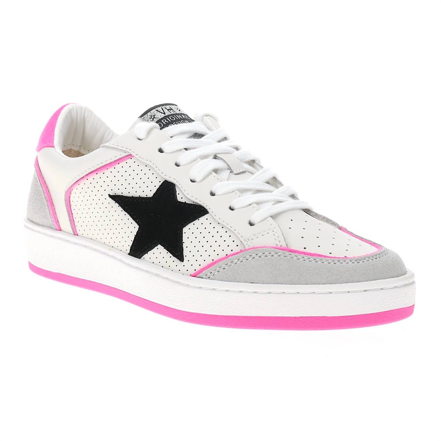 When fashion and function come together seamlessly. Step up your sneaker game with the Women's Delma Sneaker Shoes by Vintage Havana. These stylish sneakers in a clean white hue feature a playful black star with a pop of fuchsia, delivering a bold statement. Made from genuine leather, they boast a classic round toe shape for timeless appeal. Perfect for adult women seeking both comfort and flair in their footwear collection.