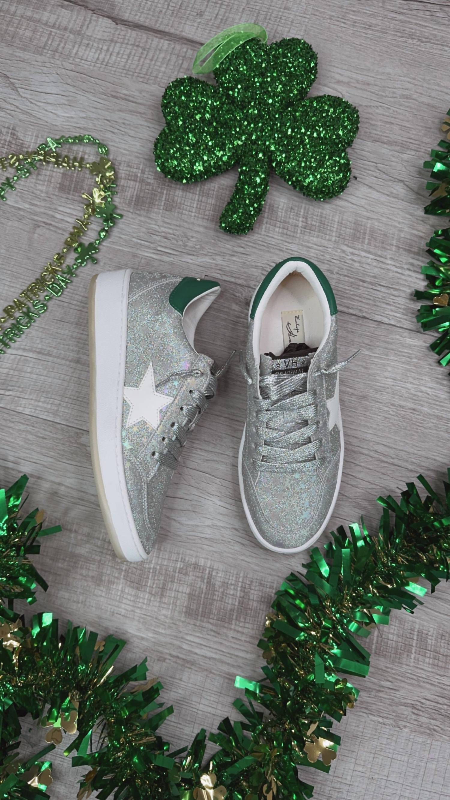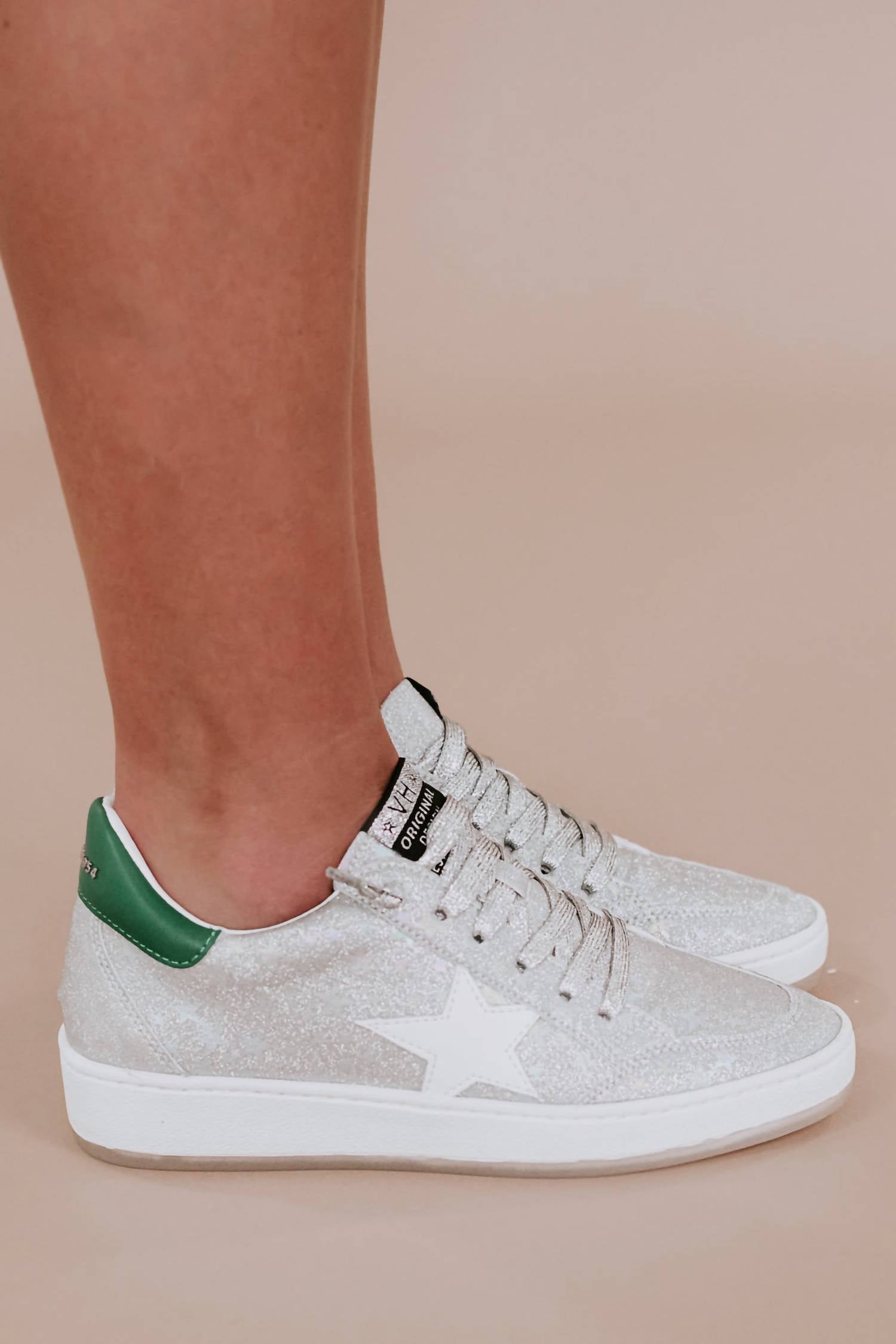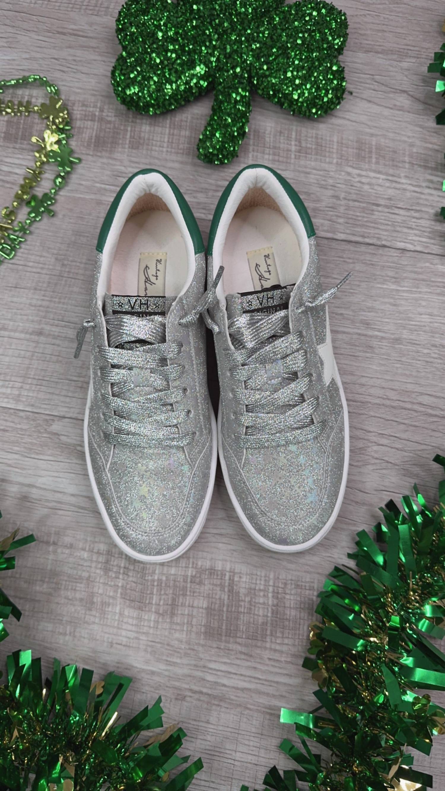 Step into game day style with the Women's Denisse Sneaker by Vintage Havana, featuring a captivating Silver/Stars colorway. These sneakers sport a chic green heel detail and eye-catching silver stars, embodying an effortless blend of comfort and flair. The round toe and wedge heel make them suitable for any evening event, especially during the spring season.