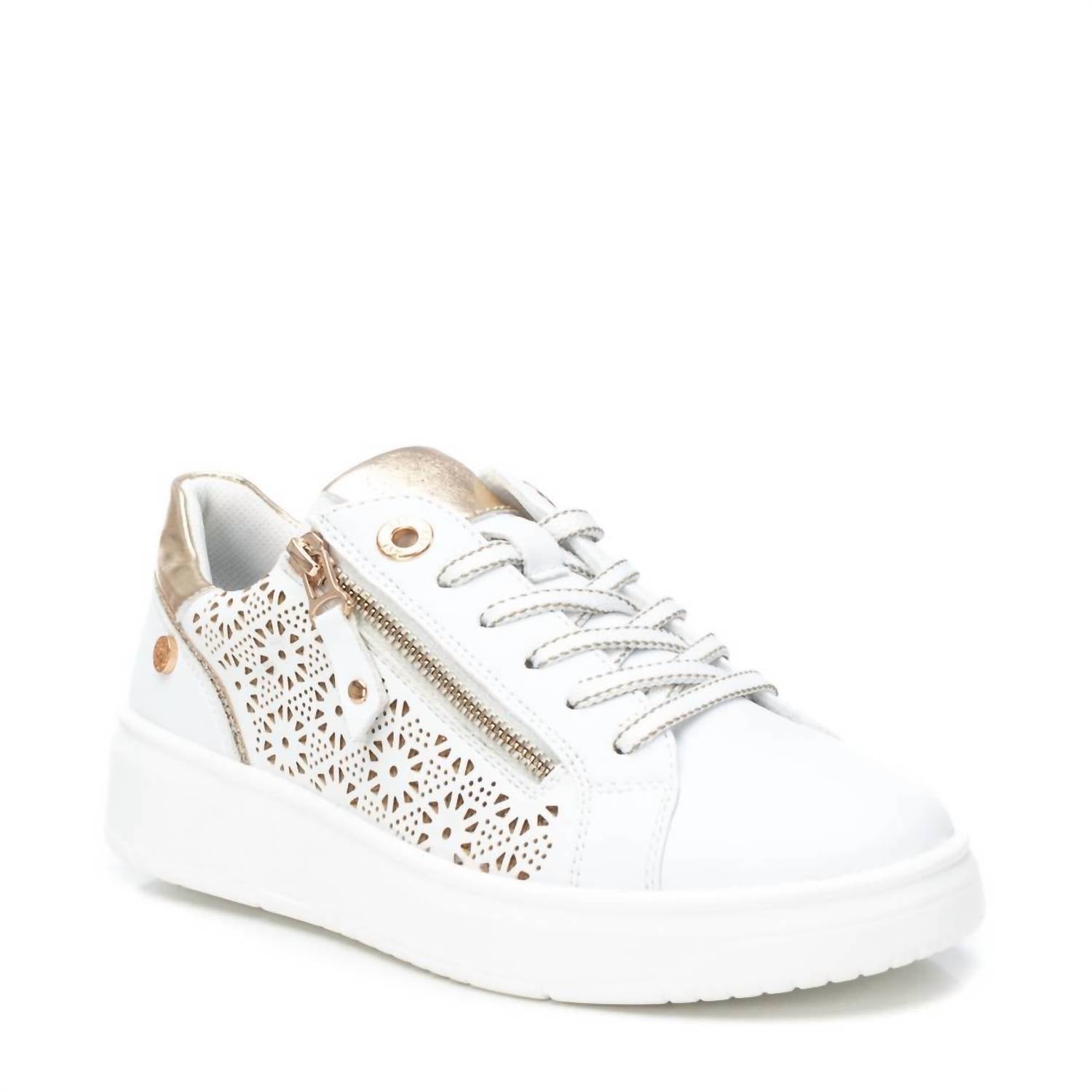 Get your daily steps in with these adorable sneakers. Elevate your casual ensemble with the Women's Trainer Sneakers, crafted in elegant faux leather for a sophisticated touch. Designed with a side zip closure and decorative laces, these vegan-certified sneakers feature small die-cut details enhancing their chic appeal. With a non-slip rubber sole and a removable insole, they promise both style and comfort for daily wear. Perfect for the fashion-conscious, these sneakers add flair to any outfit while ensuring reliable wearability.