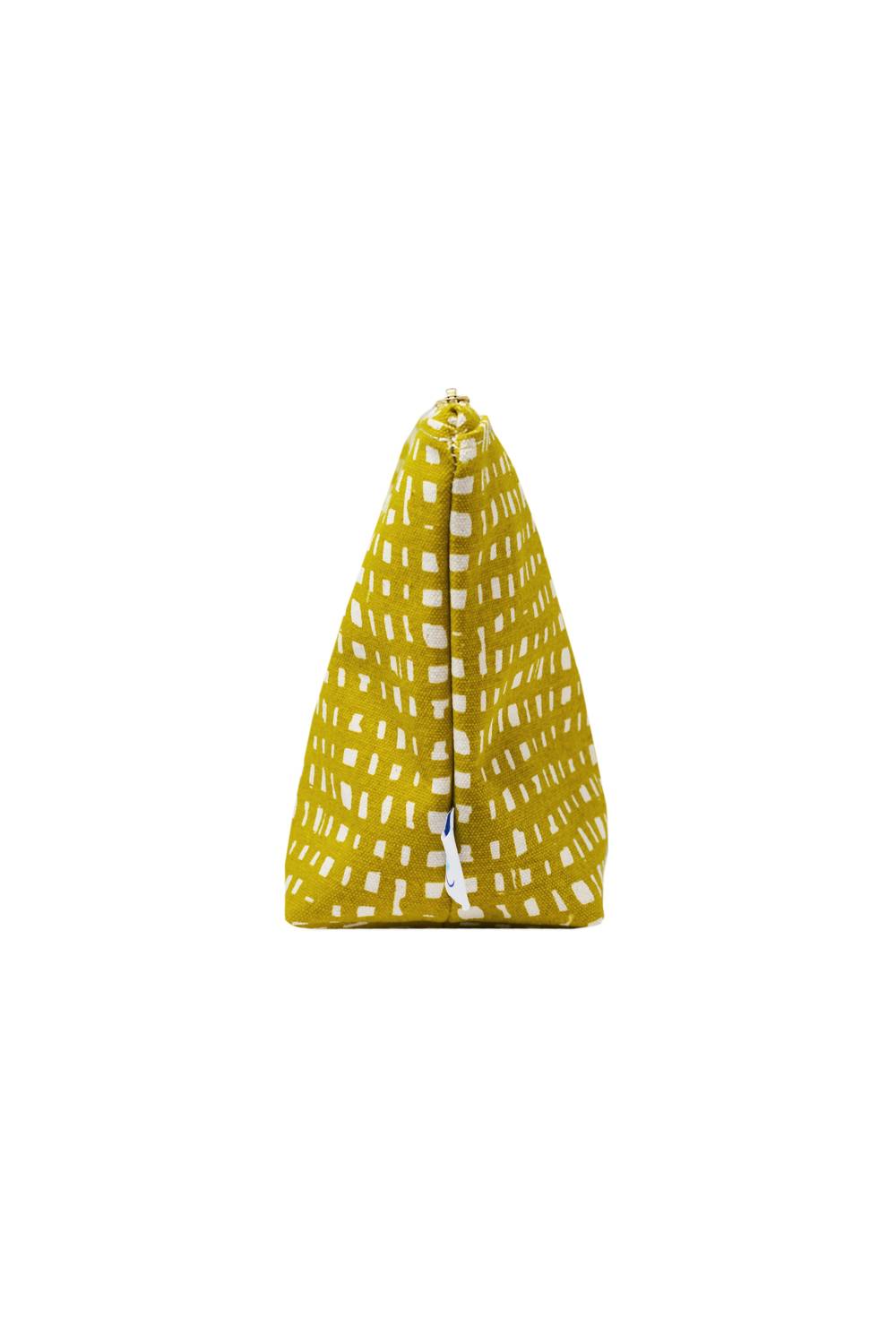 This zipper bag is the perfect balance of size and functionality, offering ample space for your essentials without taking up too much room in your suitcase. Crafted from durable 15 oz cotton canvas, it features a hand-cut pattern screen printed in golden flax. Lined with organic cotton, it measures approximately 10.5" x 7" with a 4" gusset bottom for extra storage. The brass zipper ensures a secure closure, and the screenprinting is done with eco-friendly, non-toxic ink. Spot clean is preferred, and hand wash only (do not bleach). Handmade in the USA.