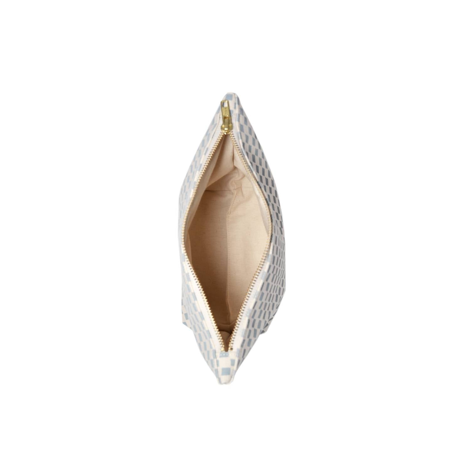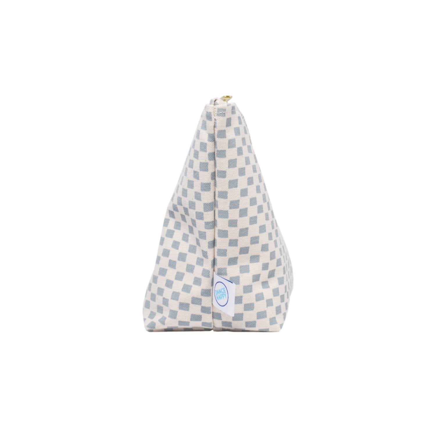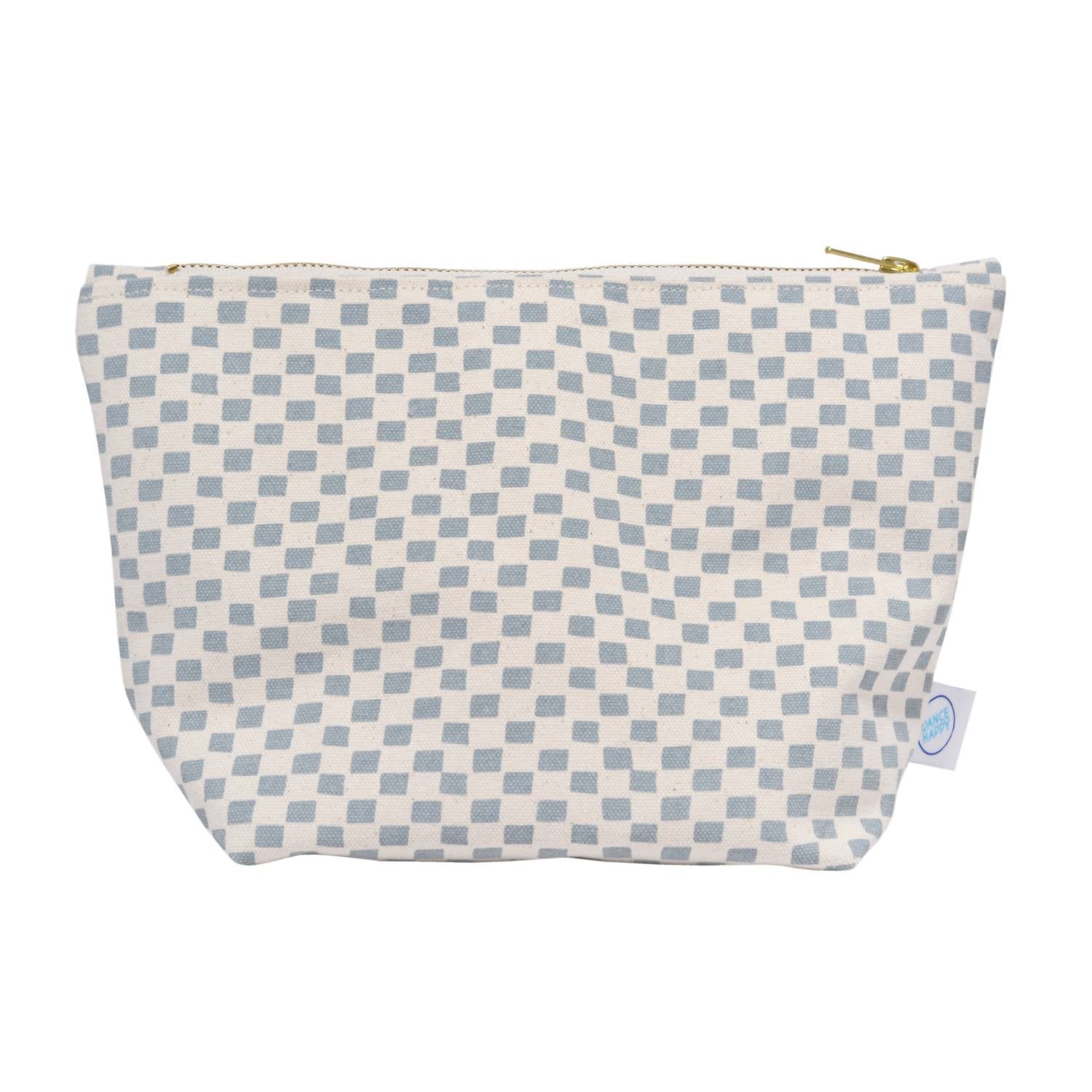 A stylish bag to use for makeup, skincare, or anything else you might want to travel with in style. Crafted from 15 oz cotton canvas in an elegant steel blue and beige combination, it features a unique hand cut pattern that is screenprinted using eco-friendly, non-toxic ink. This bag measures approximately 10.5" x 7" with a 4" gusset bottom and is lined with organic cotton. Brass zipper. Handwash only with a preference for spot cleaning, avoiding bleach. Handmade in the USA.