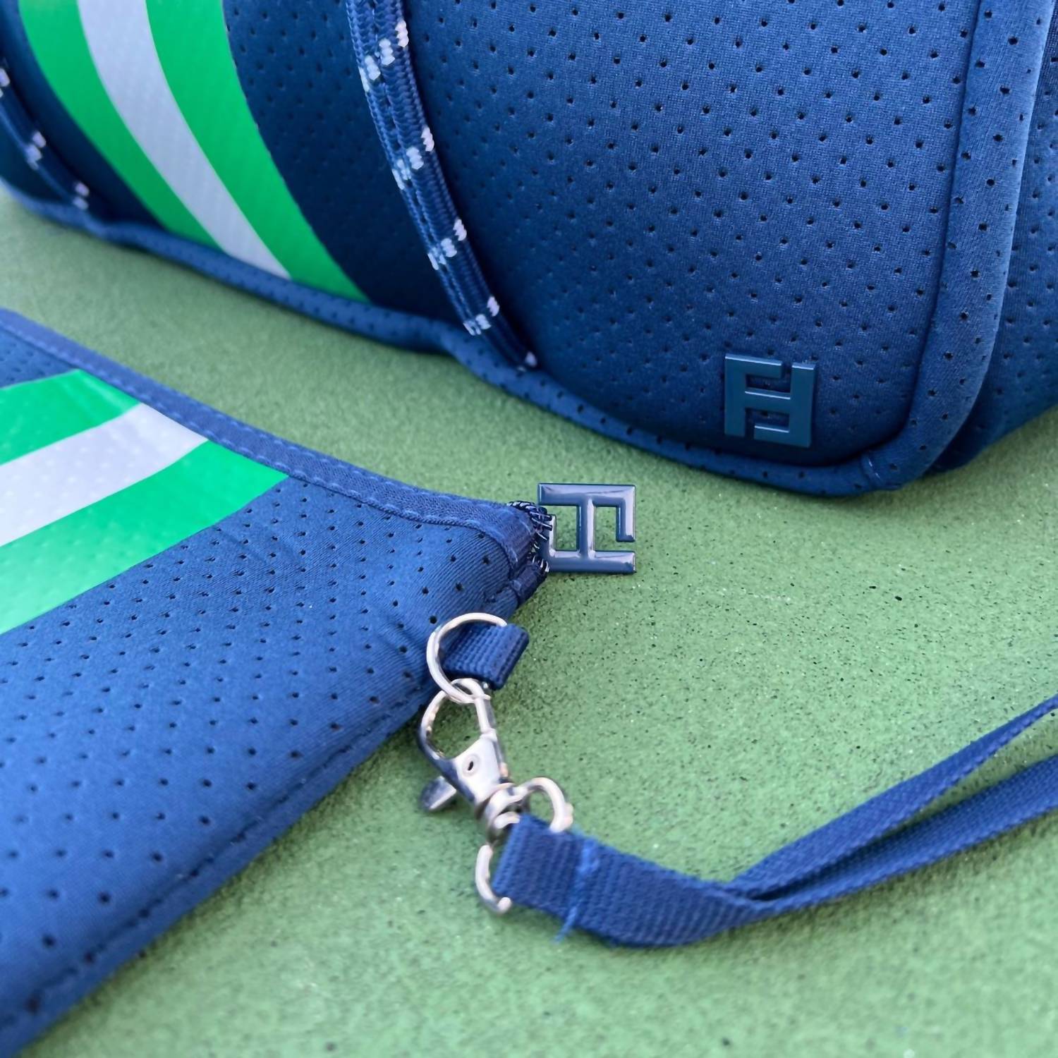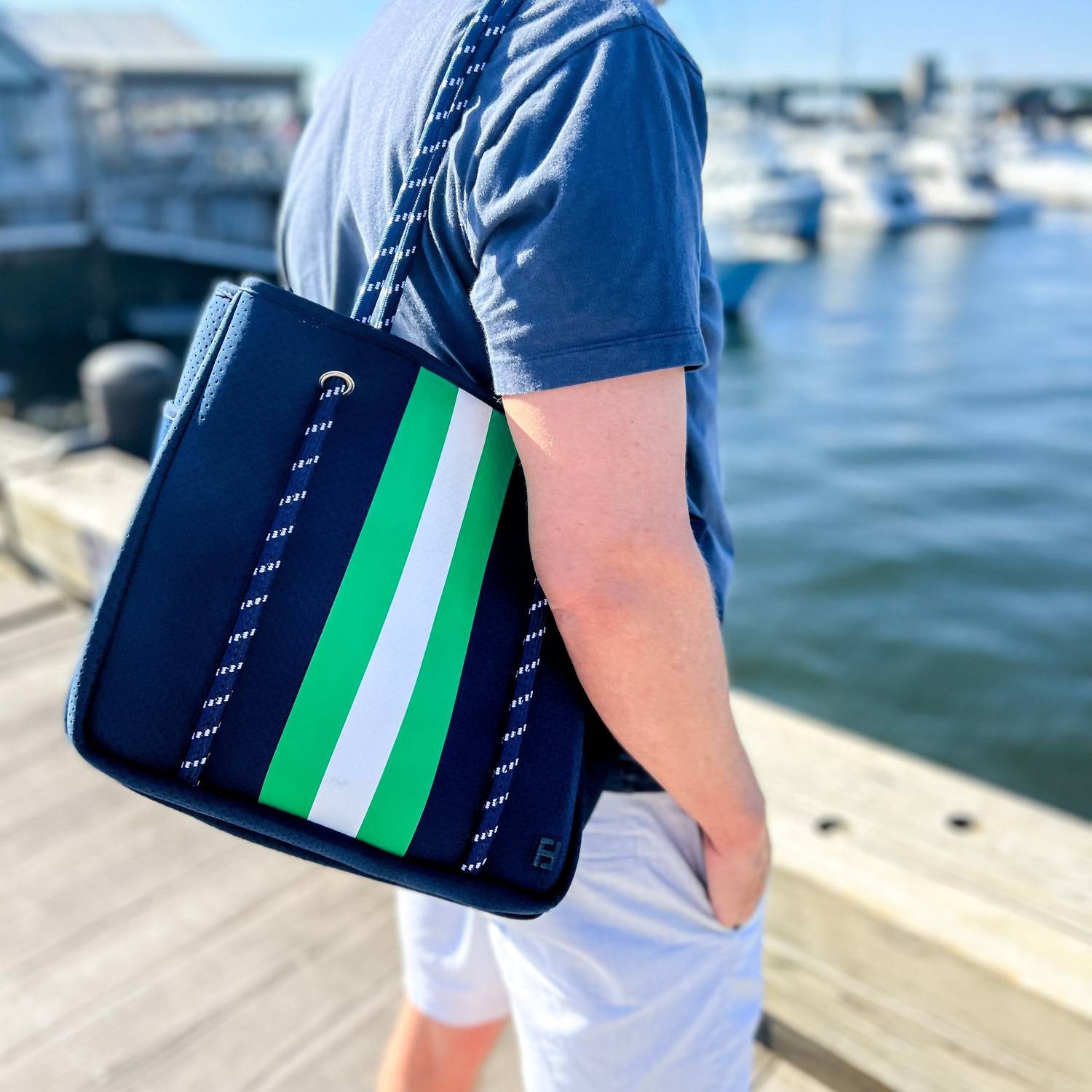 The carry-all tote bag of the season. Get in vacation mode with this perfectly sized tote bag that is the perfect accessory for beach days, pool parties, or sunset dinners. Experience the Women Courtside Small Pickleball Paddle Tote Bag by Five Love, designed in elegant navy with green and white stripes. This tote is crafted from durable neoprene, offering a water-resistant exterior that combines style and functionality. Measuring 13"L x 12"H x 7"W, it provides spacious compartments suitable for carrying up to two paddles, along with essentials such as towels and shoes. Perfect for both on and off the court, this chic accessory is a versatile addition to any occasion.