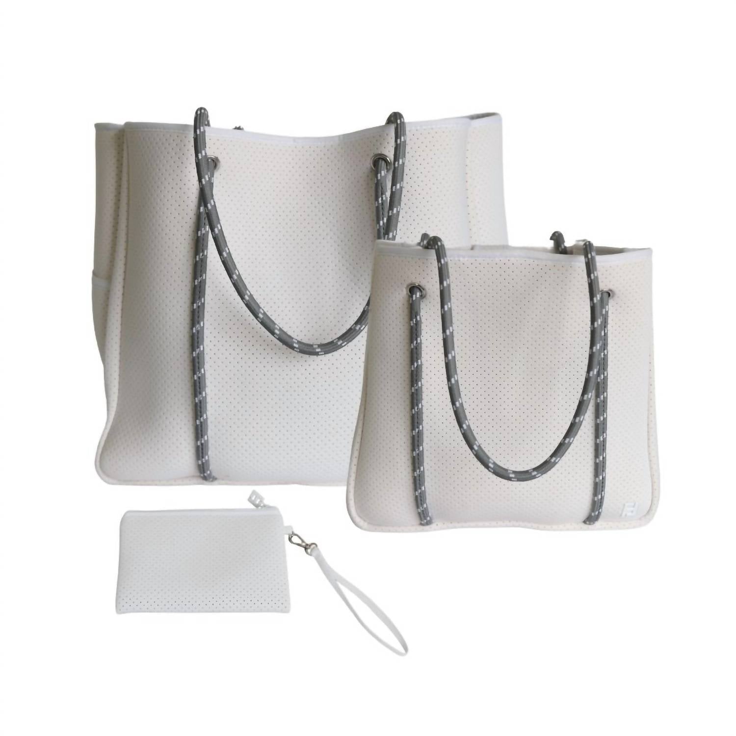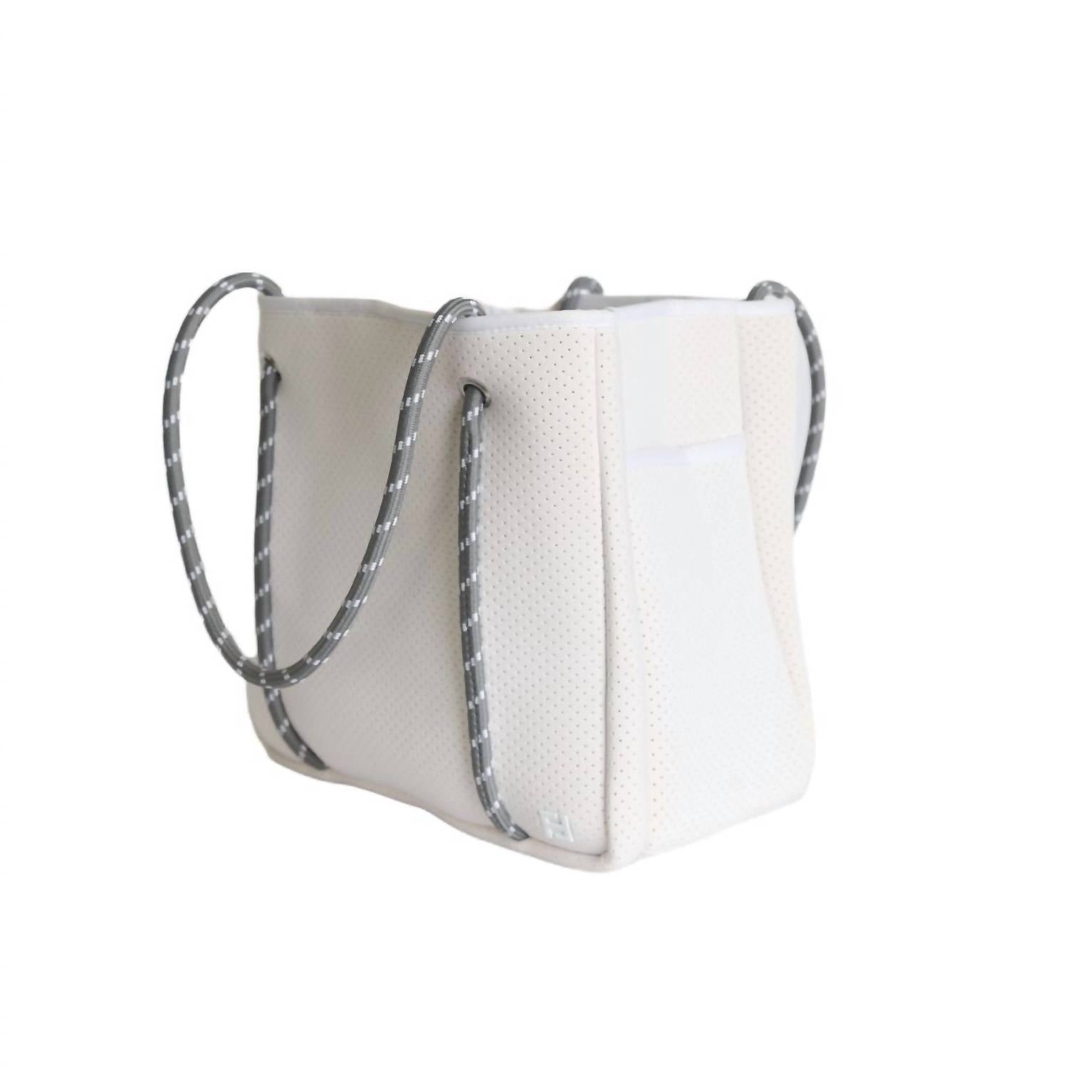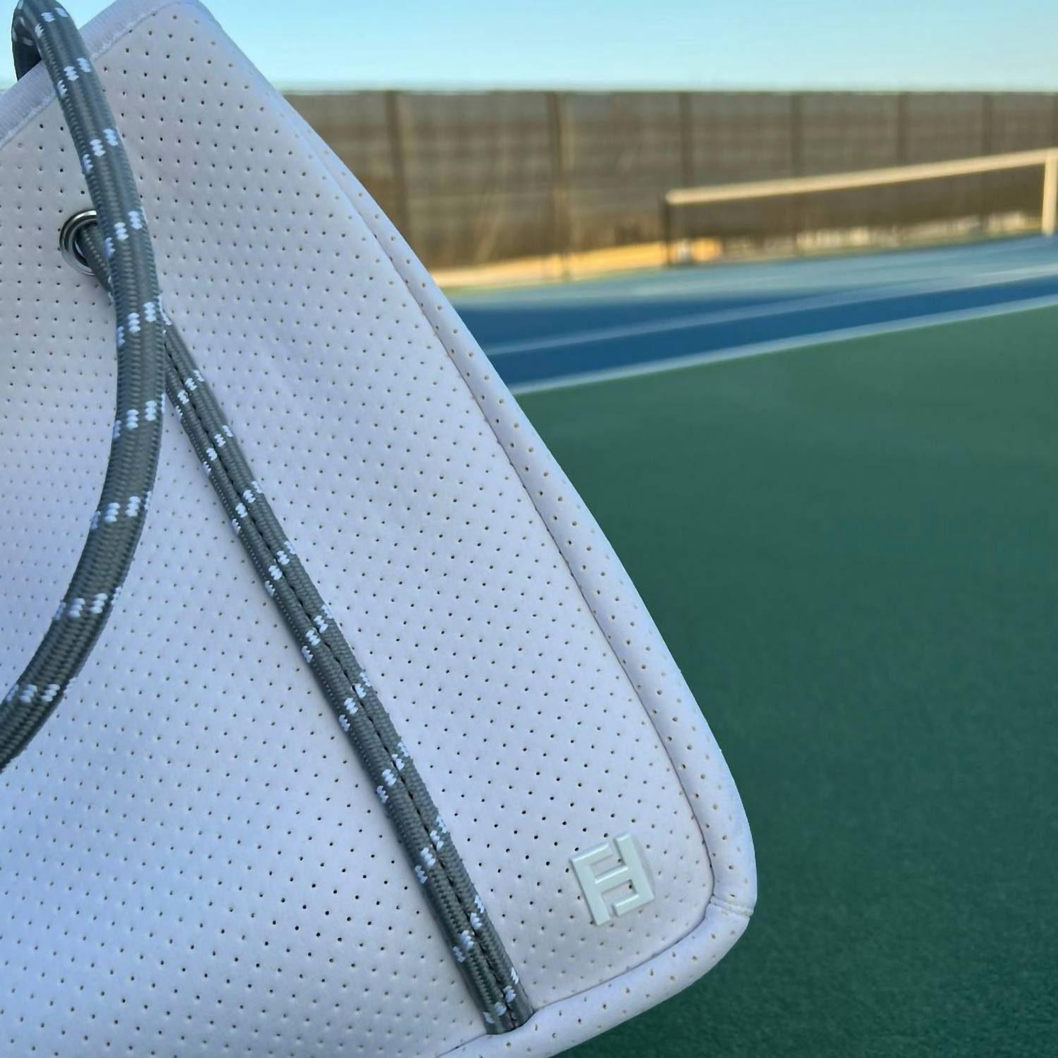 The carry-all tote bag of the season. Get in vacation mode with this perfectly sized tote bag that is the perfect accessory for beach days, pool parties, or sunset dinners. Enhance your pickleball experience with the Women Courtside Small Pickleball Paddle Tote Bag by Five Love, a perfect blend of style and practicality. Made from durable neoprene, this white tote is designed with impressive dimensions of 13” L x 12” H x 7” W. It features seven internal compartments, providing ample space for two paddles, and includes external pockets for easy access to essentials like a water bottle and phone. The water-resistant material, minimalist design, and silver hardware accents make it an ideal choice for both on and off the court adventures.