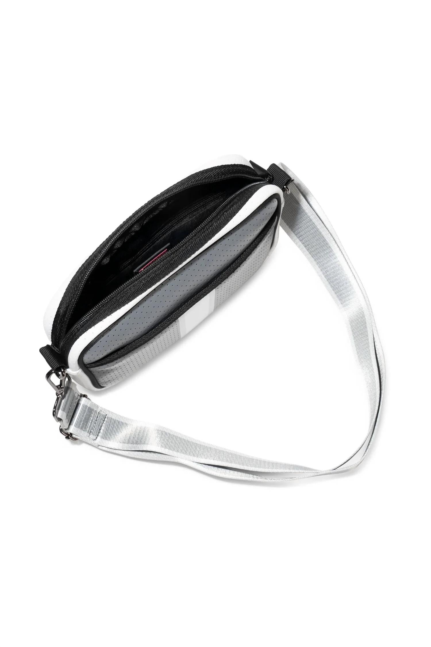 Perforated croosbody bag has zipper pocket in front, two pockets inside and an adjustable shoulder strap. Neoprene compact crossbody bag with hidden front zipper compartment Zipper at the top, 2 interior compartments 9.25 l x 2 w x 6 h.