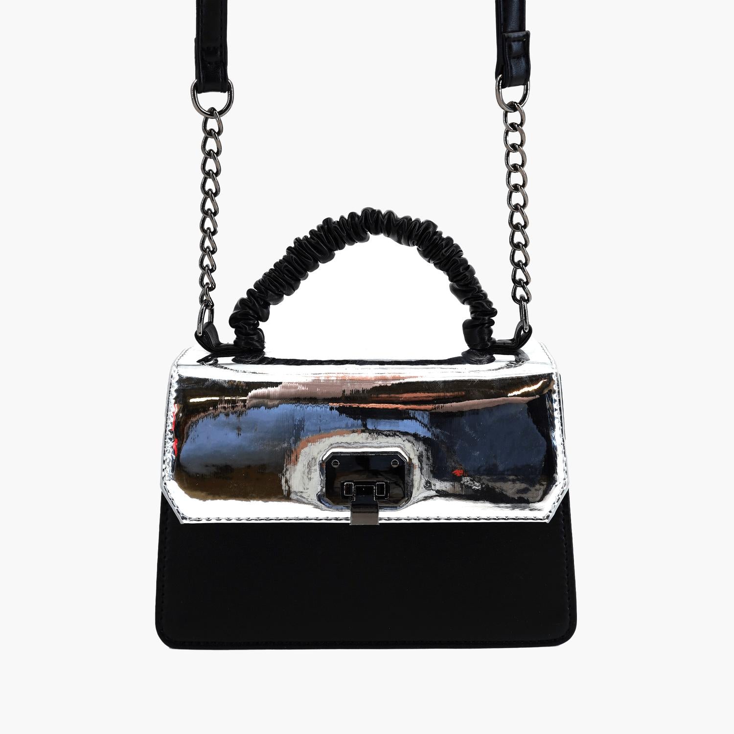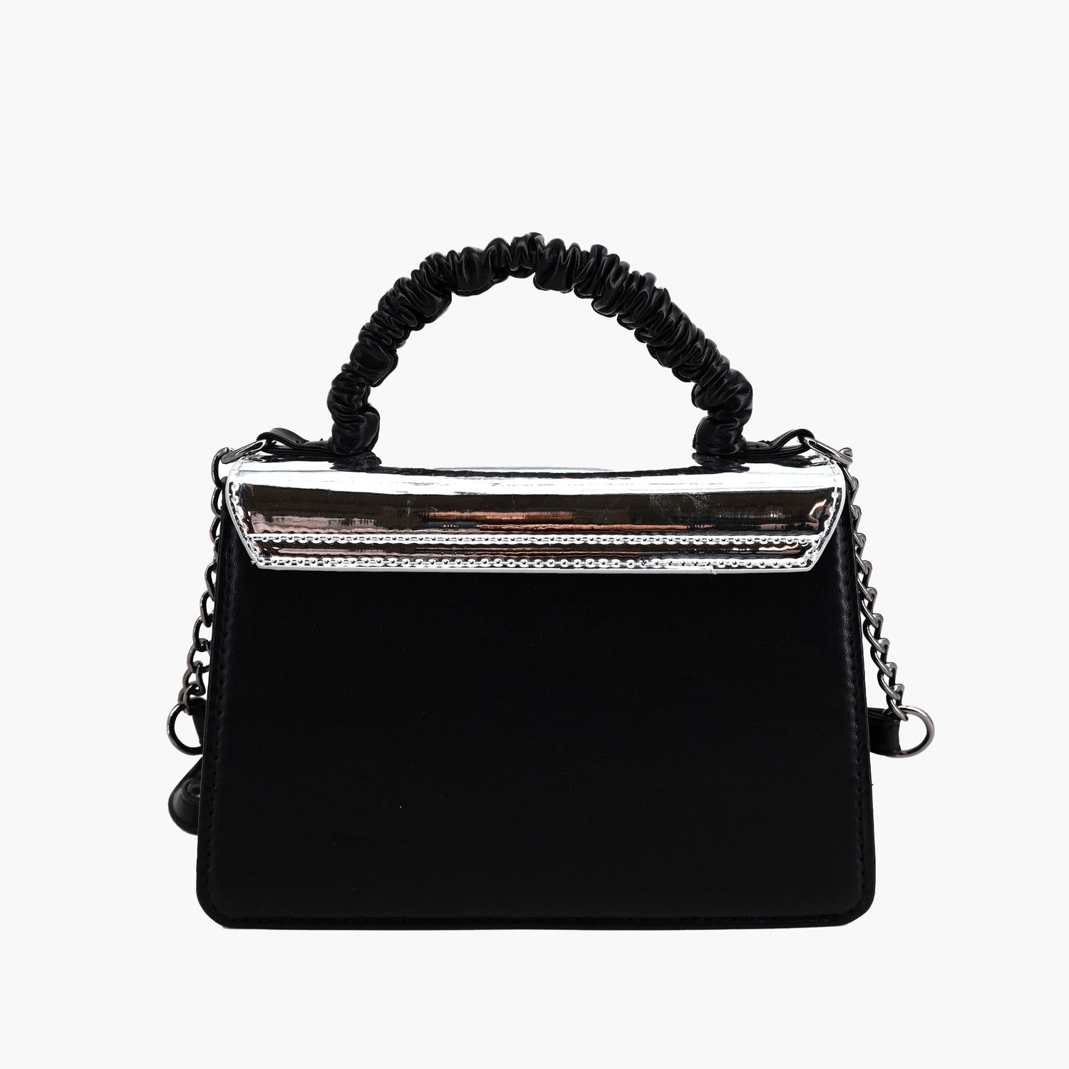 Introducing the Women's Blaze Metallic Vegan Crossbody Bag by Like Dreams, a chic black accessory with an edge. Crafted from vegan leather, this bag features a metallic overflap, a scrunchie top handle with a 2.5-inch drop, and a 22.5-inch adjustable strap for versatile wear. This compact purse, weighing 13.33 oz and measuring 7.75 inches in width, 3 inches in depth, and 5.5 inches in height, is perfect for carrying essentials on any occasion. Keep your belongings secure with a convenient snap closure.