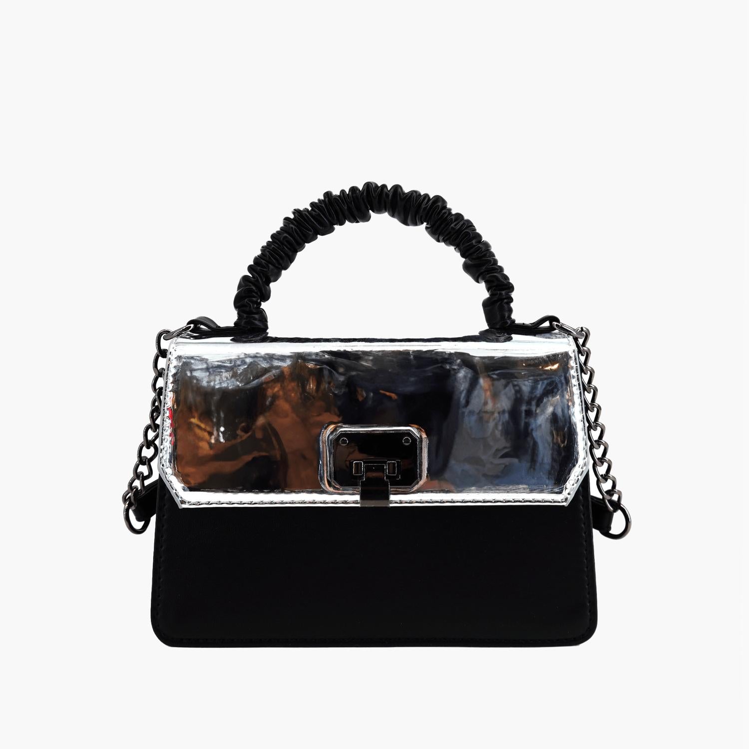 The crossbody bag is a trend that is here to stay and we especially love this style. Introducing the Women's Blaze Metallic Vegan Crossbody Bag by Like Dreams, a chic black accessory with an edge. Crafted from vegan leather, this bag features a metallic overflap, a scrunchie top handle with a 2.5-inch drop, and a 22.5-inch adjustable strap for versatile wear. This compact purse, weighing 13.33 oz and measuring 7.75 inches in width, 3 inches in depth, and 5.5 inches in height, is perfect for carrying essentials on any occasion. Keep your belongings secure with a convenient snap closure.