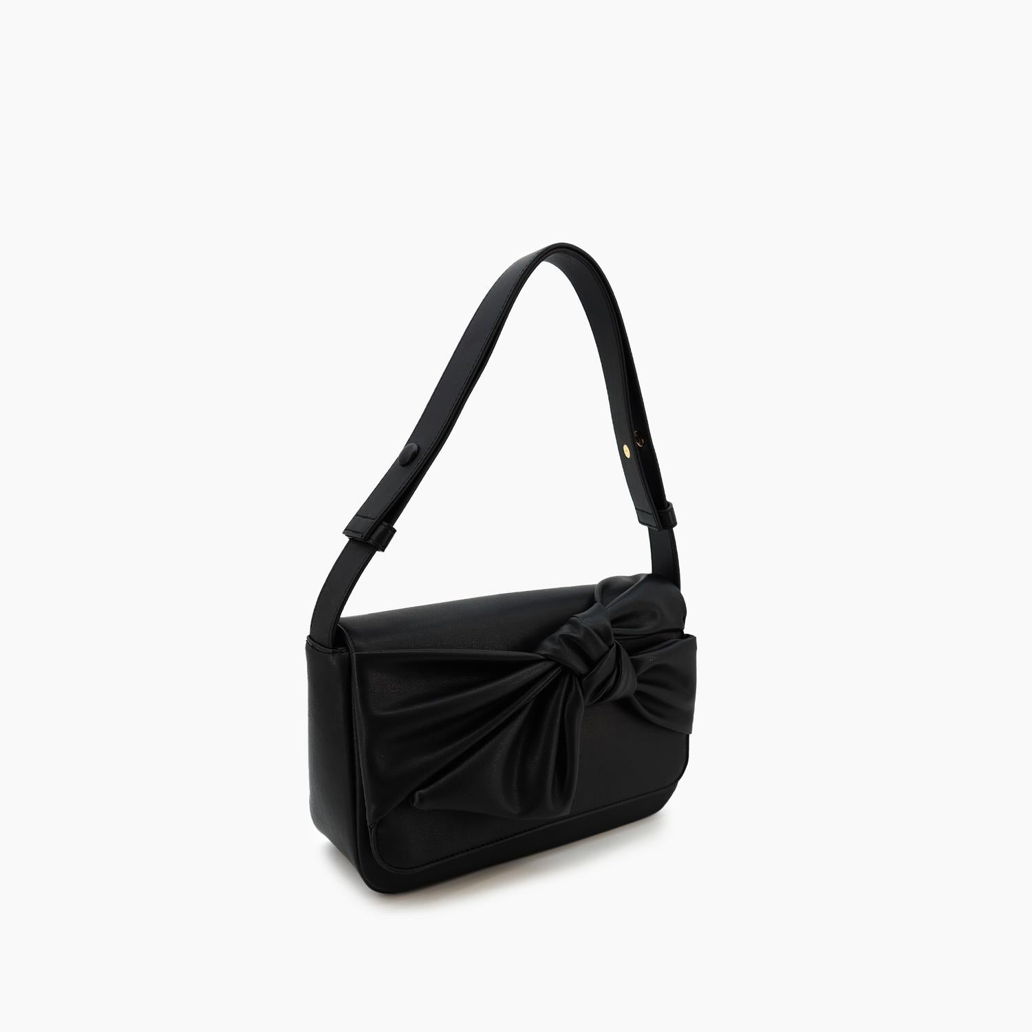 Introducing the Women's Elena Bow Vegan Shoulder Bag by Like Dreams, a chic addition to your accessory collection in timeless black. Crafted from vegan leather, this stylish bag features a stunning bow detail and a practical magnetic closure for secure storage. The bag measures 10" W x 6" H x 3" D and comes with a 23" adjustable shoulder strap, ensuring comfort and convenience. Designed with 1 main compartment and an inner zipper pocket, it effortlessly organizes your essentials.