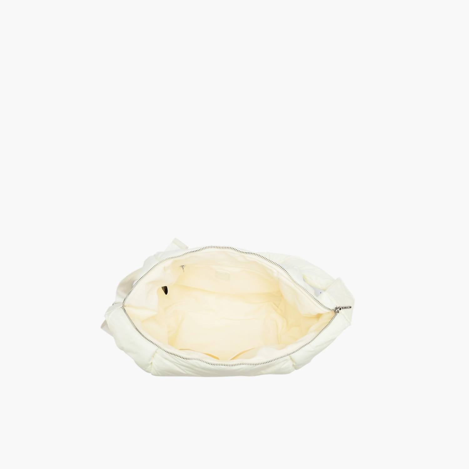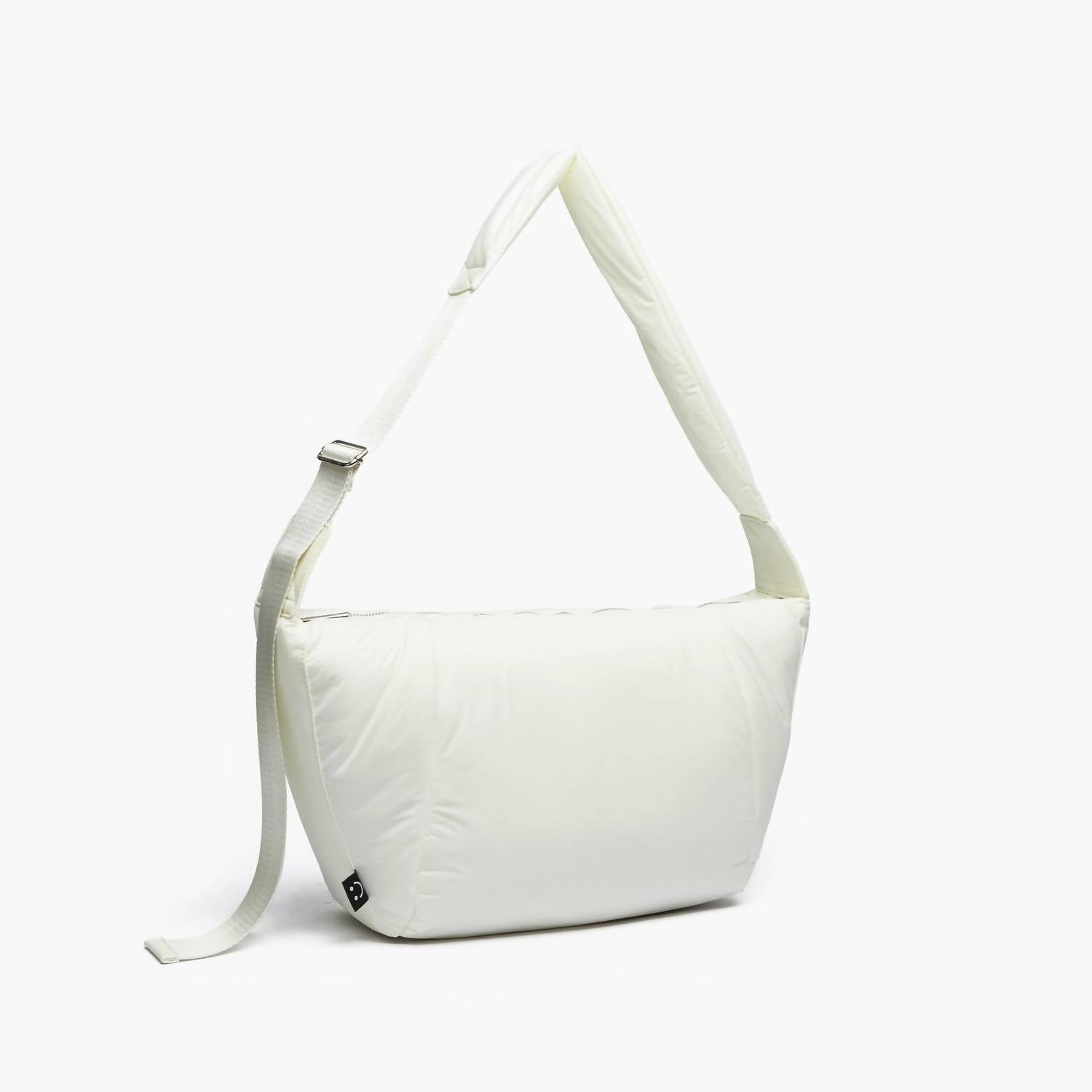 This crossbody bag will be your go-to bag of the season. Introducing the Women's Fortune Puffer Crossbody Bag by Like Dreams, a must-have for your fall and winter wardrobe. Crafted from soft nylon, this bag features a 22" adjustable wide strap for comfort and versatile styling. With metal zip closure, inner slip and zip pockets, and a chic sheen, it is designed for both fashion and function. Size: 17.5"W x 9"H x 4.5"D, weight: 11.2 oz. Available in elegant ivory.
