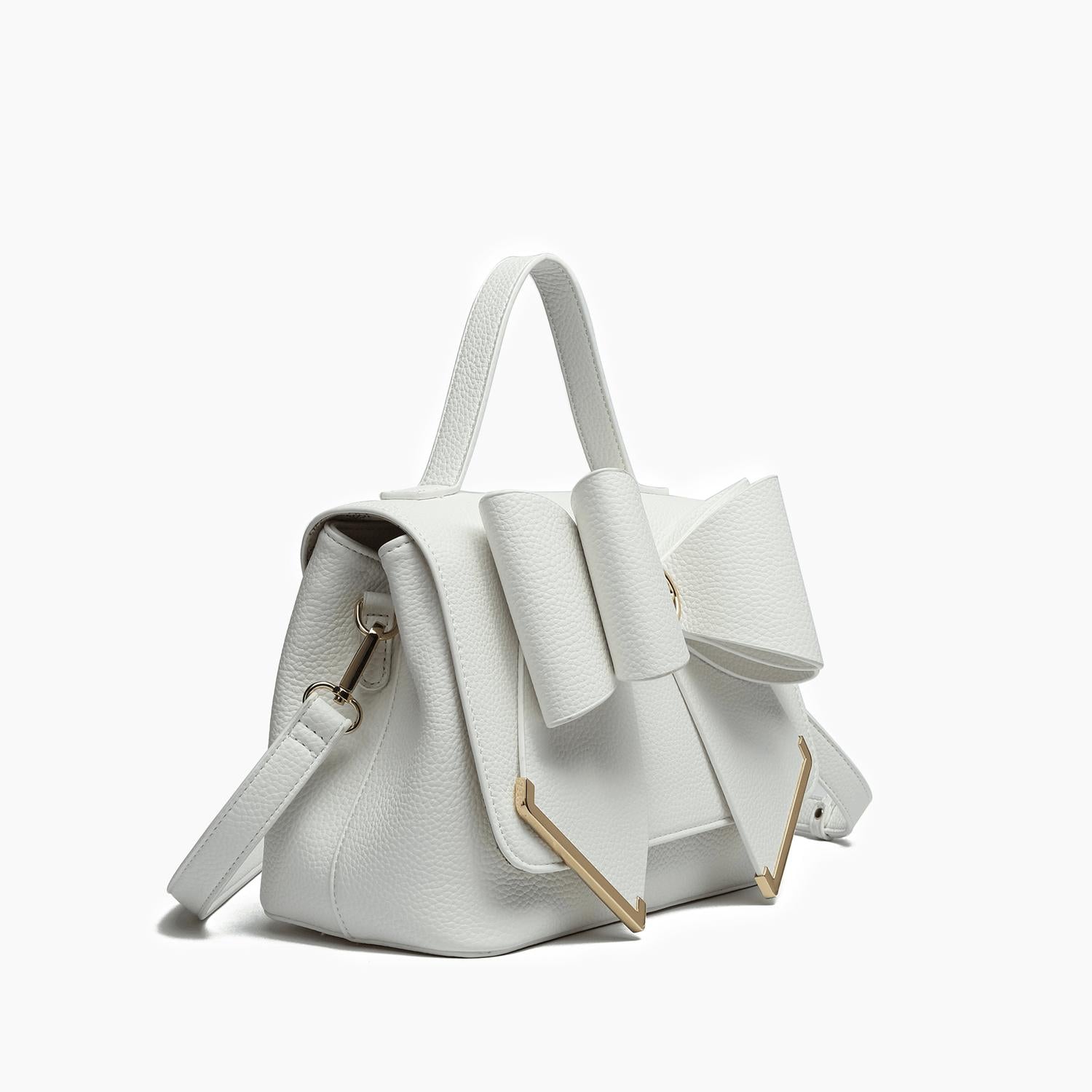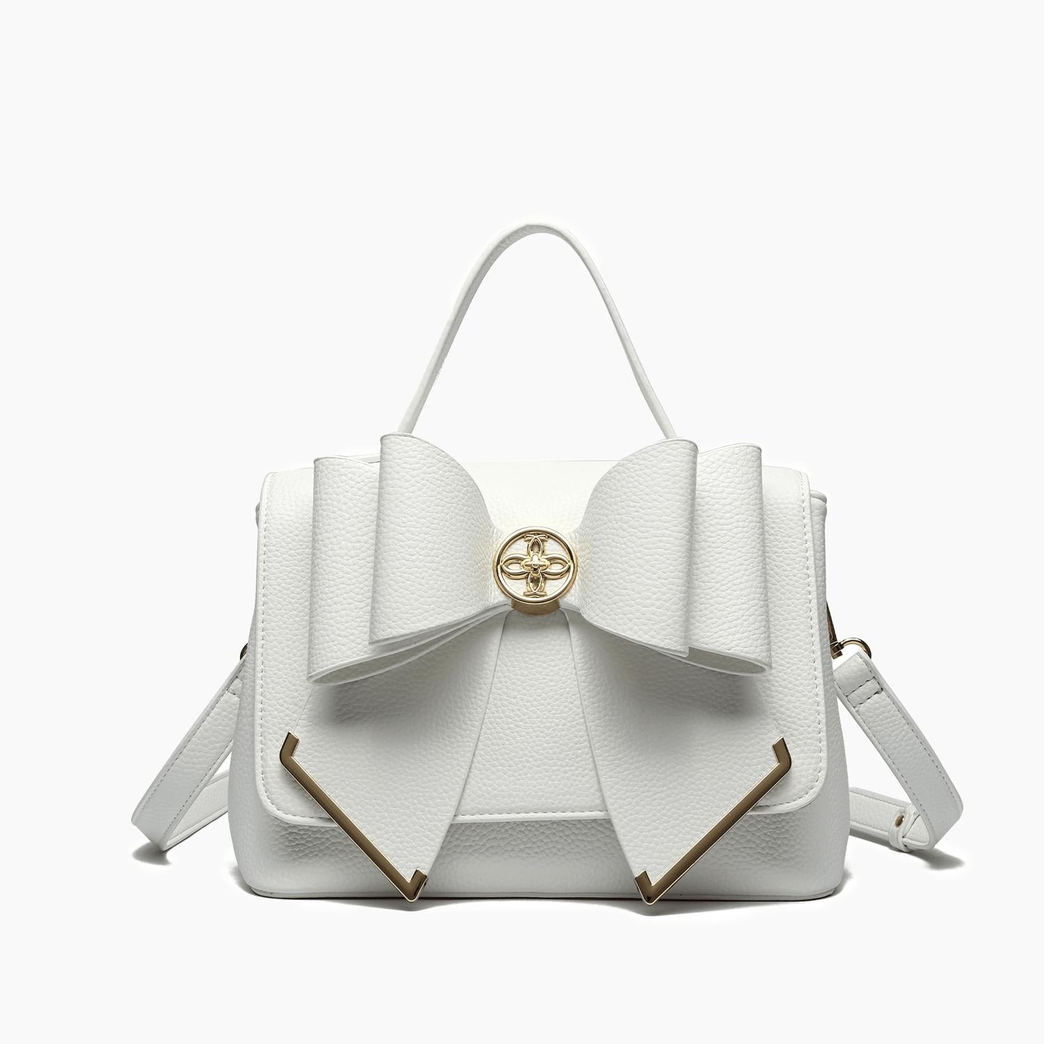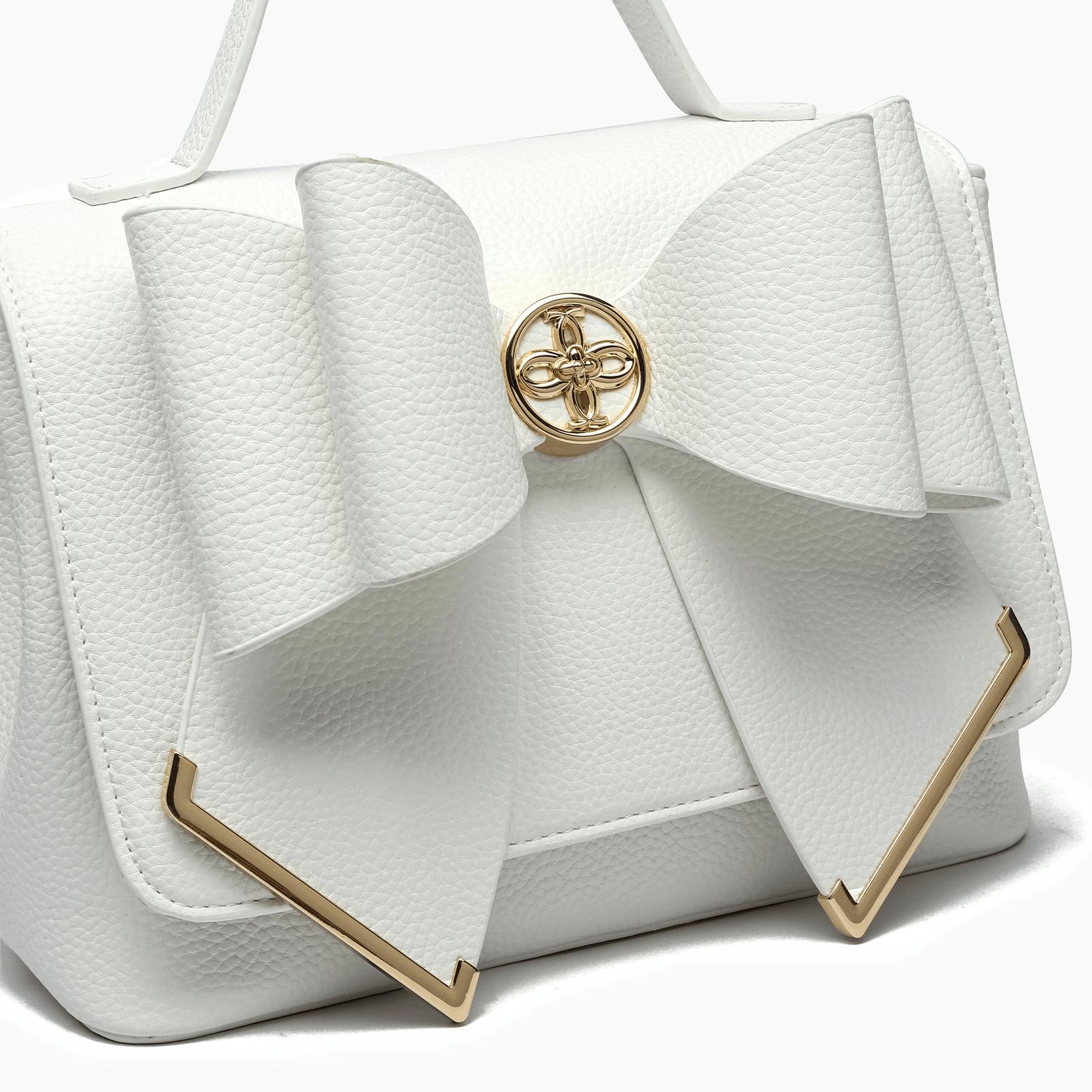 Introducing the Women's Jasmine Bow Vegan Crossbody Bag by Like Dreams, a chic accessory in timeless white. Crafted from 100% vegan leather, this bag features a magnetic snap closure and is designed for versatility with a 23" adjustable and detachable strap and a 4" top handle. Its compact dimensions of 9 3/4"W x 7"H x 5"D make it ideal for both daytime outings and romantic dinner dates. Weighing just 19.97 oz, it balances style with functionality effortlessly.