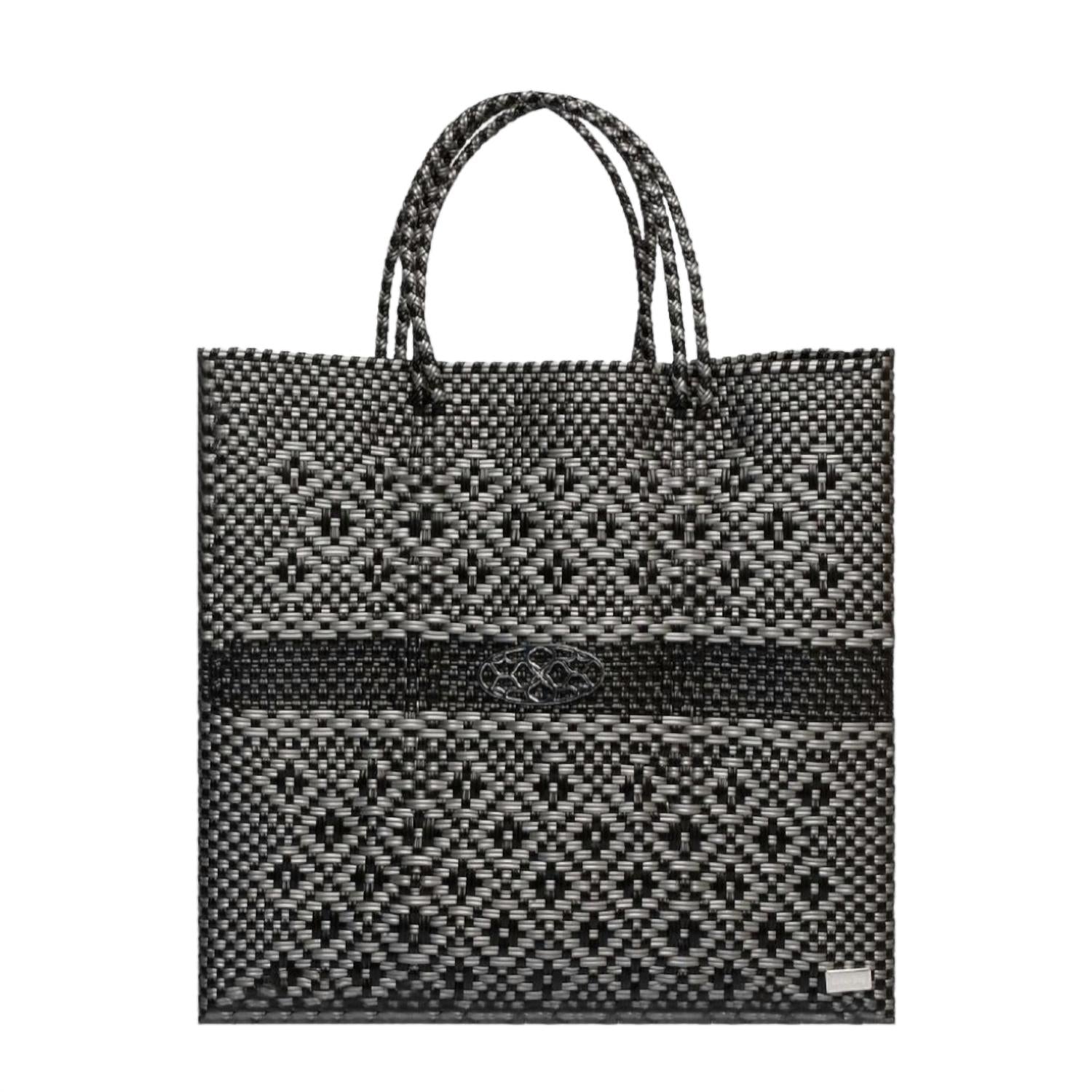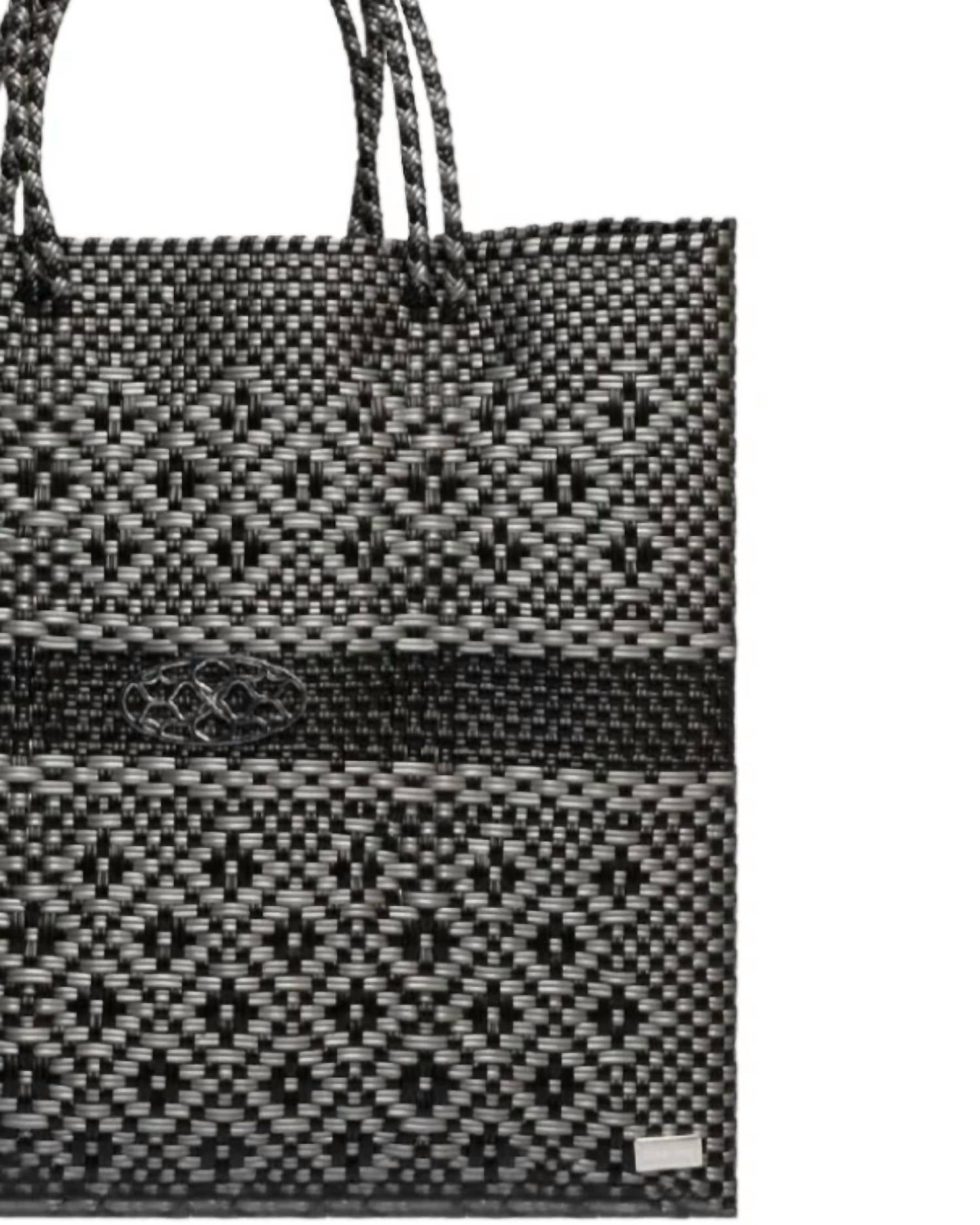 The carry-all tote bag of the season. Get in vacation mode with this perfectly sized tote bag that is the perfect accessory for beach days, pool parties, or sunset dinners. Discover the Women's Handmade Tote Bag by Lola's Bag, a beautiful piece crafted by native Mexicans from Southeast Mexico. This black/silver Aztec striped tote combines function and style, featuring braided plastic top handles and a Sterling Silver Plated Signature Medallion. Made entirely of durable, waterproof plastic, it is perfect for daily use and is hand washable. Approximate measurements: 12.59 inches x 4.72 inches x 13 inches, ensuring it's lightweight and reliable for all your carrying needs.
